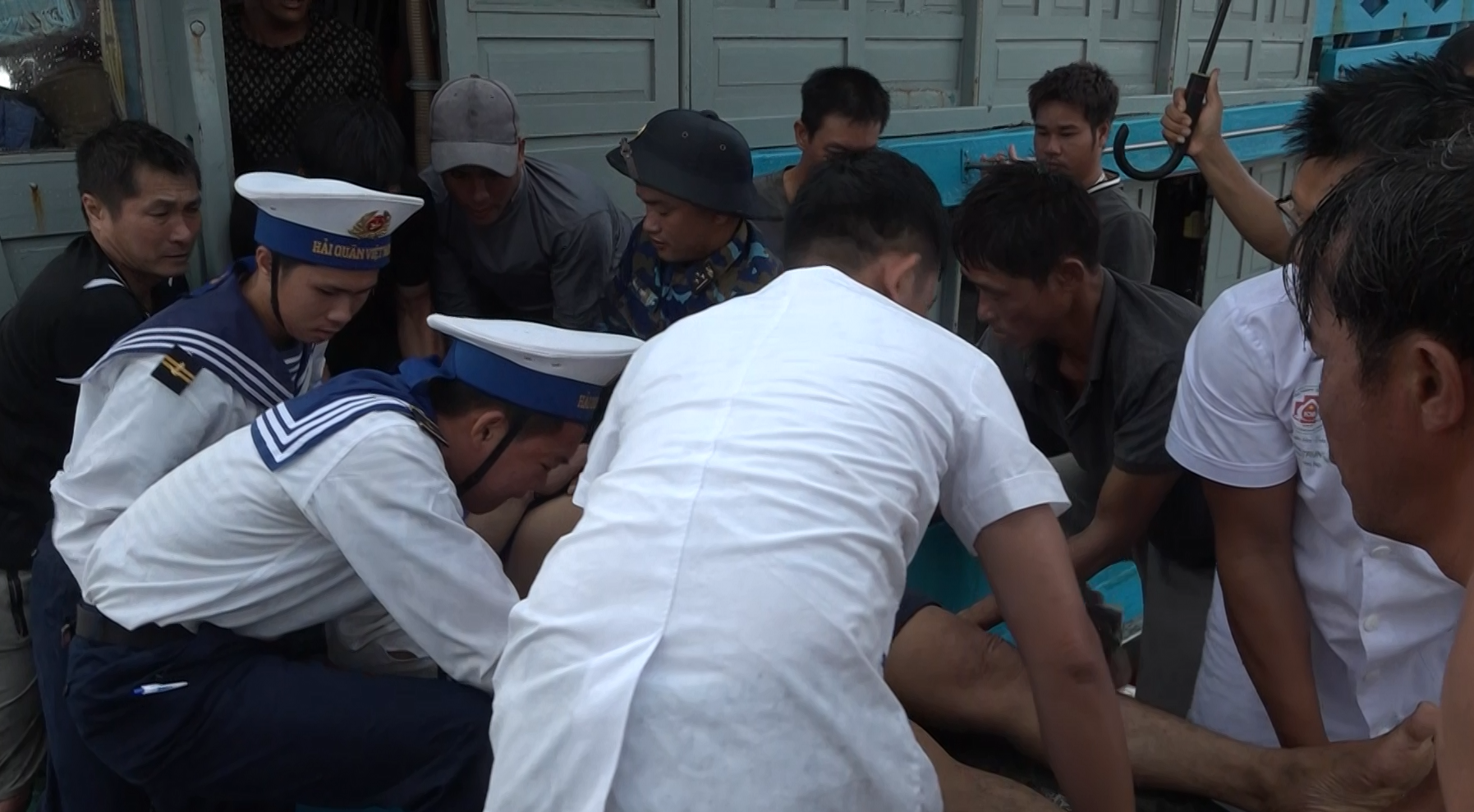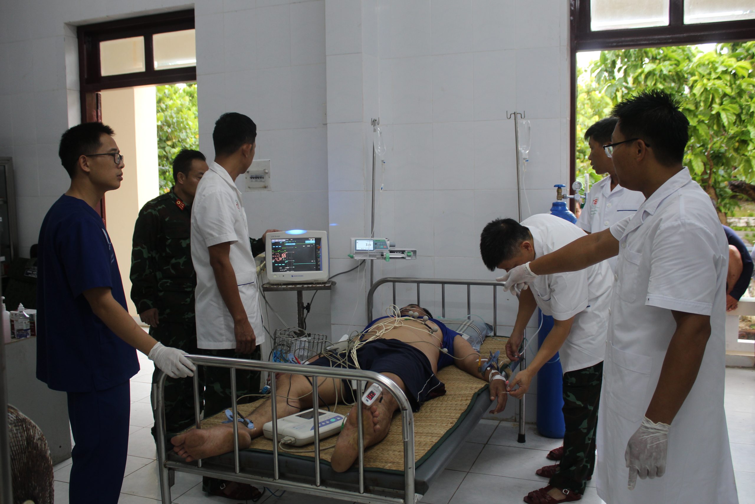 Các y, bác sĩ tại bệnh xá đã khẩn trương tiến hành hồi sức tim phổi, thở oxy, truyền dịch, sử dụng thuốc vận mạch và hội chẩn với Viện Y học Hải quân để triển khai phác đồ điều trị tái tăng áp kéo dài, kết hợp các biện pháp hồi sức tích cực khác. Hiện bệnh nhân vẫn trong tình trạng rất nặng, tiên lượng xấu.