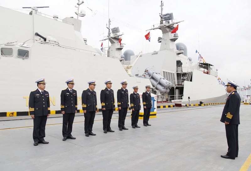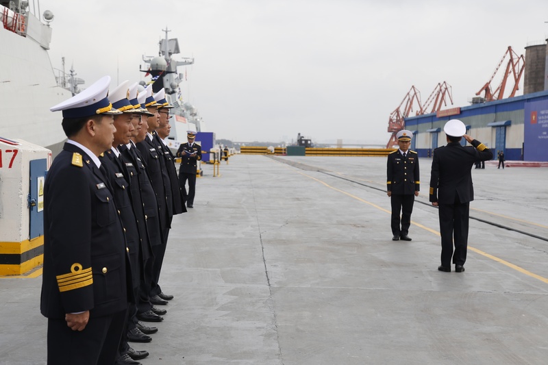 Chỉ huy biên đội tàu Hải quân Việt Nam và Trung Quốc đã phối hợp luyện tập nội dung đón Bộ trưởng Bộ Quốc phòng hai nước tham dự các hoạt động tại lễ khởi hành.