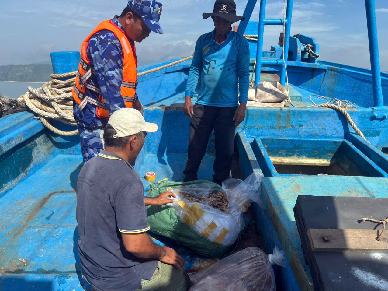 Tại thời điểm kiểm tra, trên tàu có 4 thuyền viên, do ông Lê Đô, 57 tuổi, trú tại phường Phổ Thạnh, thị xã Đức Phổ (Quảng Ngãi) làm thuyền trưởng. Thuyền trưởng Đô khai nhận, tàu đang vận chuyển số thực phẩm nói trên là mực khô với số lượng khoảng gần 3 tấn. Thuyền trưởng và các thuyền viên không chứng minh được nguồn gốc hợp pháp của số hàng hoá đang vận chuyển trên tàu.