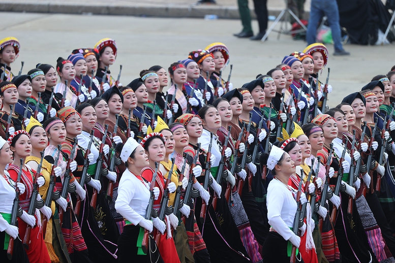 Tiếp theo là Khối chiến sĩ Pháo binh – Tên lửa. Là hỏa lực mặt đất chủ yếu của Quân đội ta, ra đời từ những ngày đầu gian khó vai trần, chân đất, Pháo binh vinh dự được bắn phát đạn đầu tiên mở màn cho toàn quốc kháng chiến và chiến dịch Điện Biên Phủ, đồng thời bắn hỏa lực cuối cùng vào Bộ Tổng tham mưu Ngụy quyền vào ngày 30/4/1975, lập nhiều chiến công xuất sắc, xây đắp nên truyền thống “Chân đồng vai sắt, đánh giỏi, bắn trúng”.