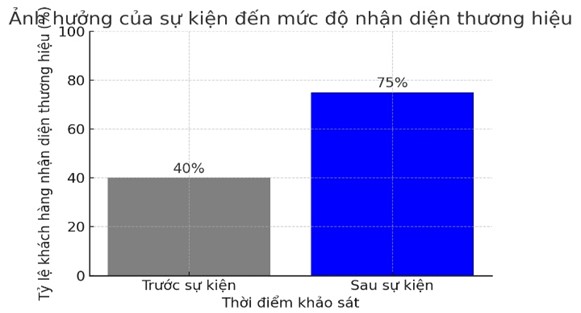 Biểu đồ dưới đây thể hiện mức độ ảnh hưởng của sự kiện đến nhận diện thương hiệu. Trước sự kiện, chỉ 40% khách hàng nhận biết thương hiệu, nhưng sau sự kiện, con số này tăng lên 75%, cho thấy vai trò quan trọng của sự kiện trong việc nâng cao nhận thức thương hiệu.