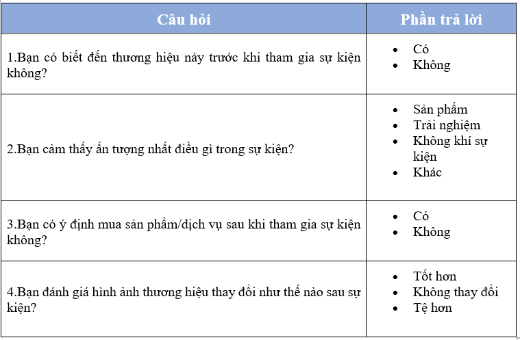 Bảng khảo sát dưới đây giúp đo lường tác động của sự kiện đến nhận thức và hình ảnh thương hiệu:
