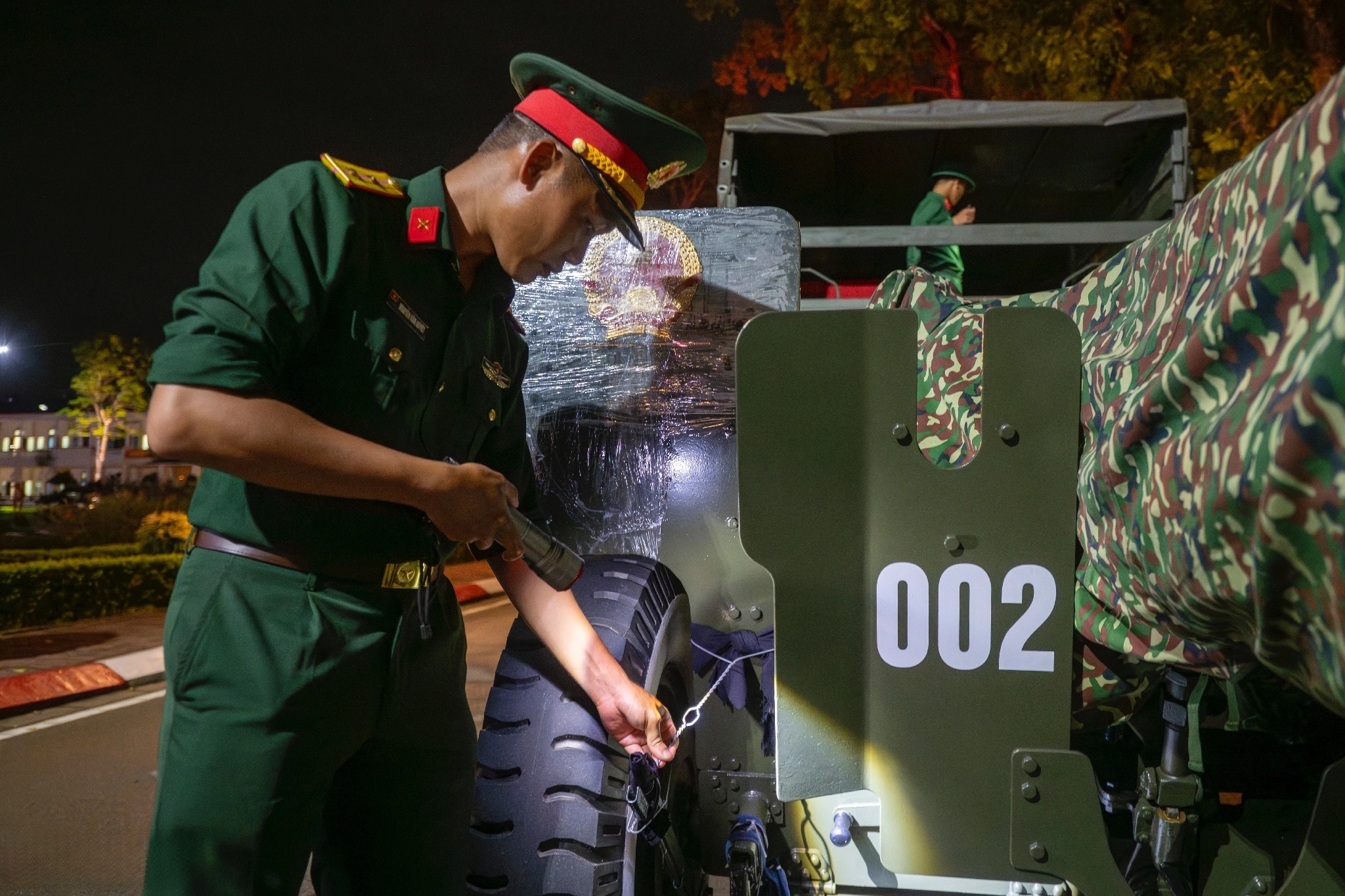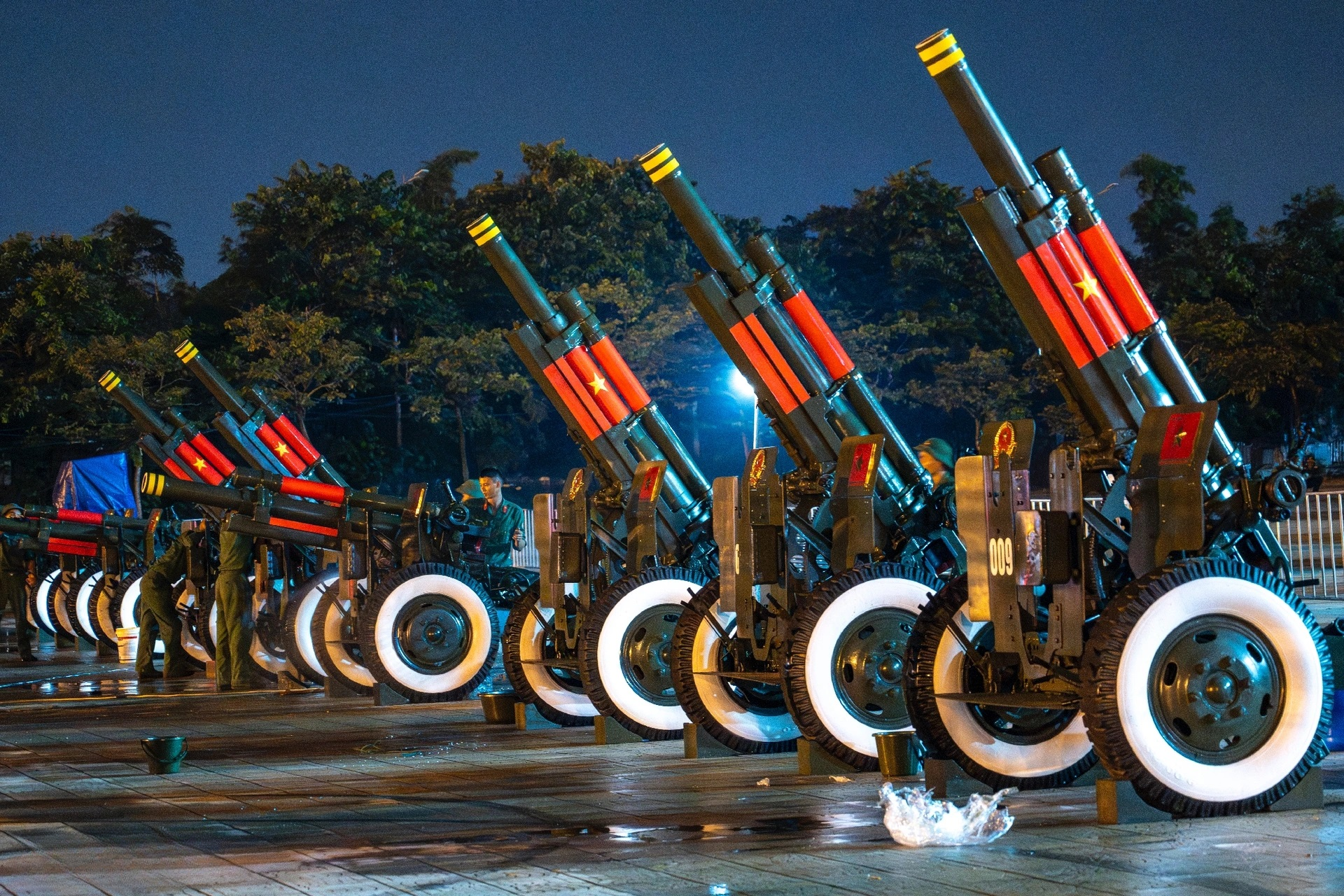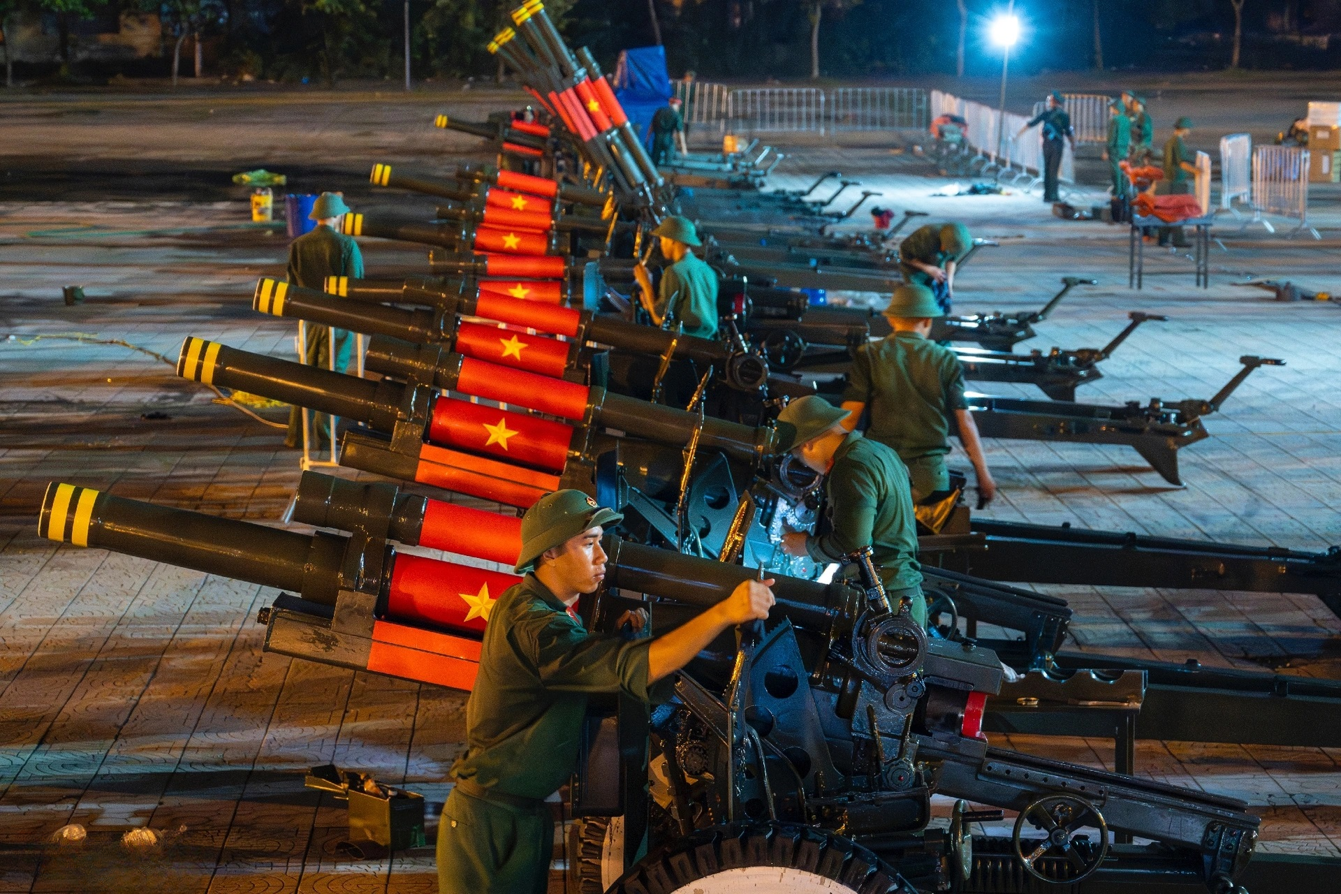 Khoảng 22 giờ 30 phút, đoàn xe an toàn có mặt tại khu vực Mỹ Đình. Ngay lập tức, lực lượng pháo thủ tiến hành tháo bạt, di chuyển từng khẩu pháo vào vị trí đã được bố trí trước. Công tác vệ sinh, lau chùi, bảo dưỡng pháo được thực hiện ngay trong đêm bằng máy xịt áp lực cao, nhằm bảo đảm các khẩu pháo ở trạng thái kỹ thuật tốt nhất trước giờ khai hỏa. Từng bước chuẩn bị đều được triển khai bài bản, không để xảy ra bất kỳ sai sót nào, khẳng định tinh thần sẵn sàng hoàn thành xuất sắc nhiệm vụ.