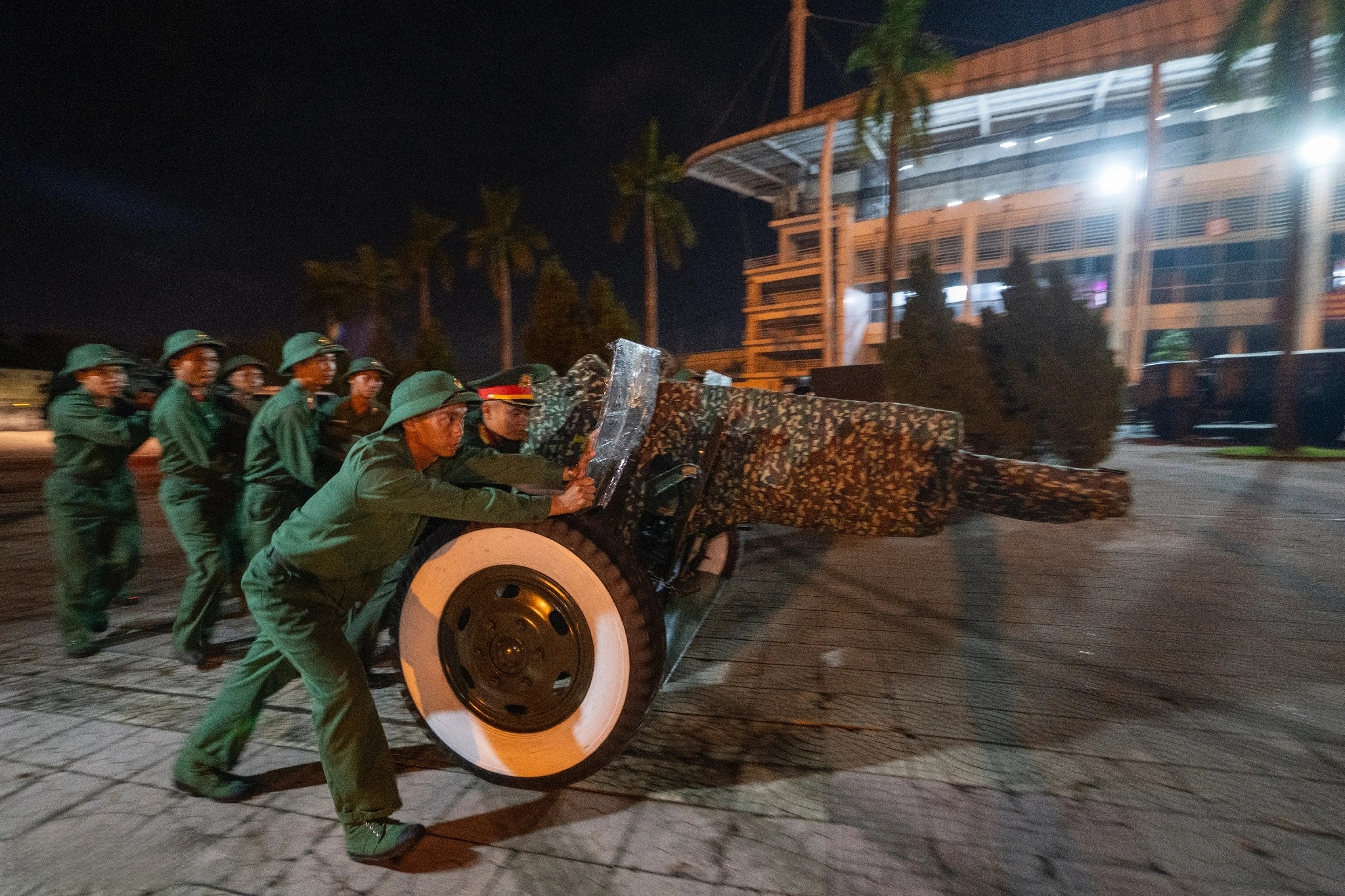 Đúng 21 giờ 05 phút, đoàn gồm 15 xe kéo pháo được phủ bạt kín xuất phát rời đơn vị, tiến về Sân vận động Mỹ Đình. Quãng đường di chuyển dài khoảng 37 km được thực hiện với tốc độ trung bình 25 km/giờ, bảo đảm an toàn tuyệt đối, giữ gìn trạng thái trang nghiêm của đội hình cơ động. Trên suốt hành trình, các chiến sĩ duy trì đội hình chặt chẽ, phối hợp nhịp nhàng, thể hiện tác phong chính quy, hiện đại.