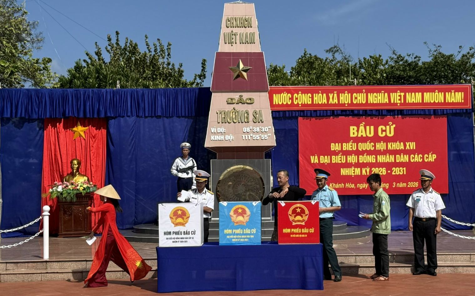 Sau khi hoàn thành nhiệm vụ bỏ phiếu, thành viên Tổ bầu cử sẽ đóng dấu “đã bỏ phiếu” lên góc trái thẻ cử tri. Chị Lê Thị Minh Diệu, người dân đang sinh sống trên đảo Trường Sa cho biết: Tôi rất tự hào vì đã thực hiện xong quyền và nghĩa vụ công dân của mình. Tôi kỳ vọng các đại biểu được bầu sẽ thực sự là những người có đức, có tài, đại diện cho ý chí và nguyện vọng của Nhân dân; tiếp tục quan tâm, chăm lo phát triển kinh tế – xã hội, củng cố quốc phòng – an ninh, đặc biệt là đời sống của quân và dân ở đặc khu Trường Sa để Trường Sa sớm trở thành trung tâm kinh tế, văn hóa, xã hội trên biển của cả nước, là pháo đài vững chắc bảo vệ chủ quyền biển, đảo của Tổ quốc.