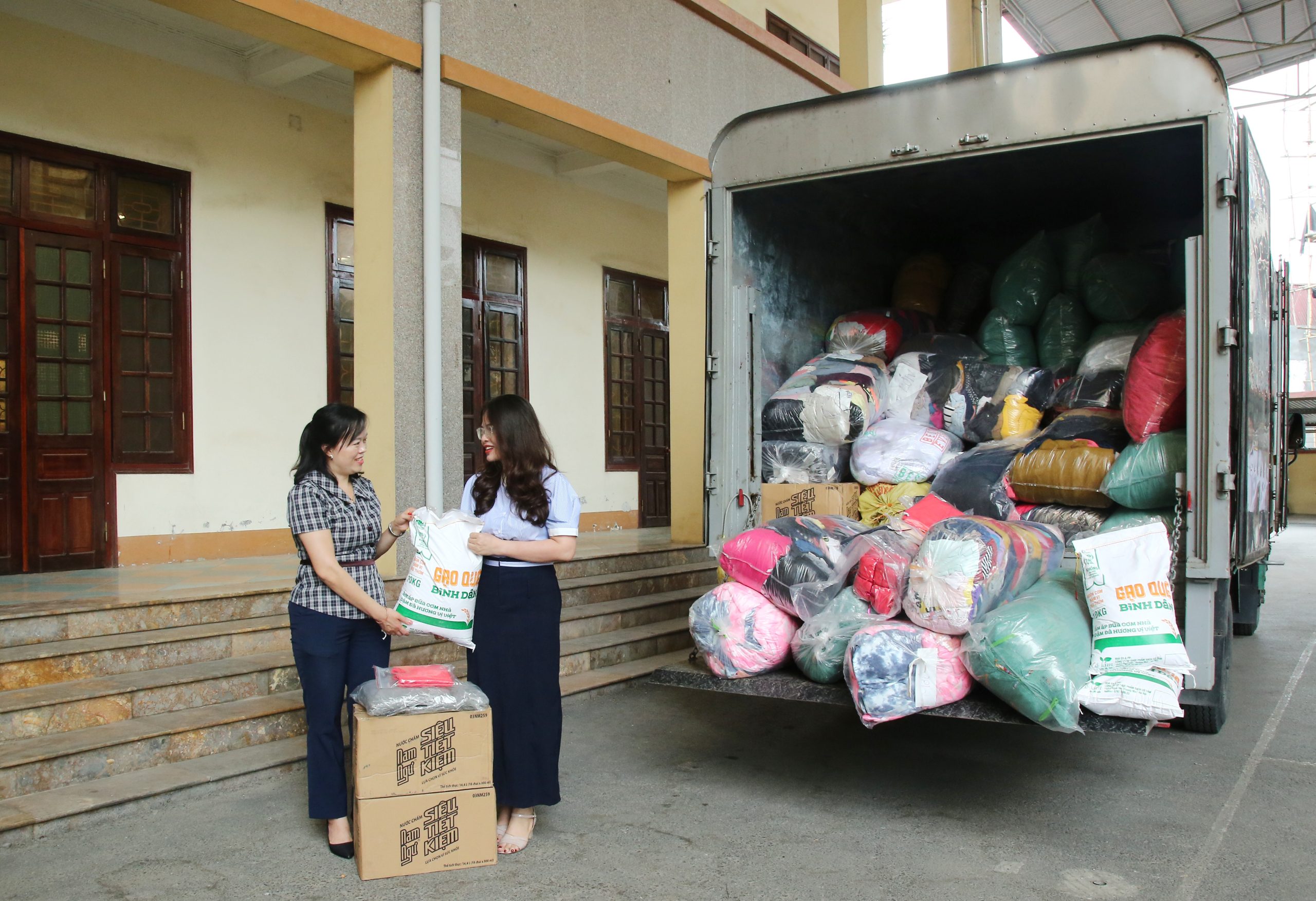 Tại đây, đoàn công tác đã trực tiếp bàn giao cho Mặt trận Tổ quốc huyện Mù Cang Chải 65 triệu đồng tiền mặt, 2,5 tạ gạo; 10 thùng nước mắm, hơn 1000 áo sơ mi, áo phông; 200 bộ chăn, màn, tất mùa đông…