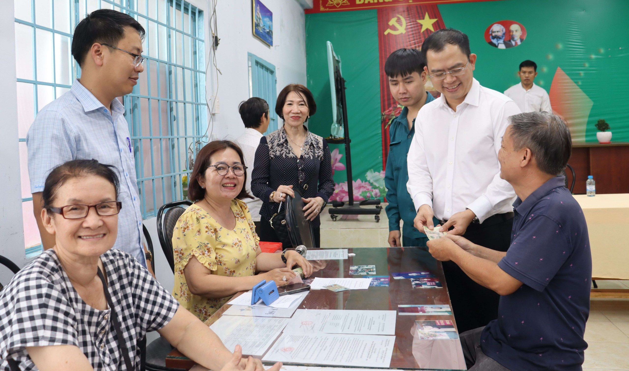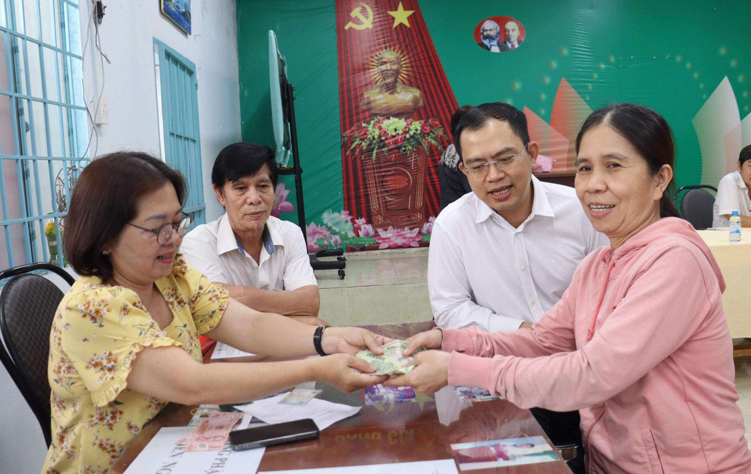 Lãnh đạo xã Long Thành trao tặng 100 ngàn đồng quà của Trung ương cho người dân ấp Phước Hải dịp quốc khánh 2-9. Ảnh: Nguyệt Hà