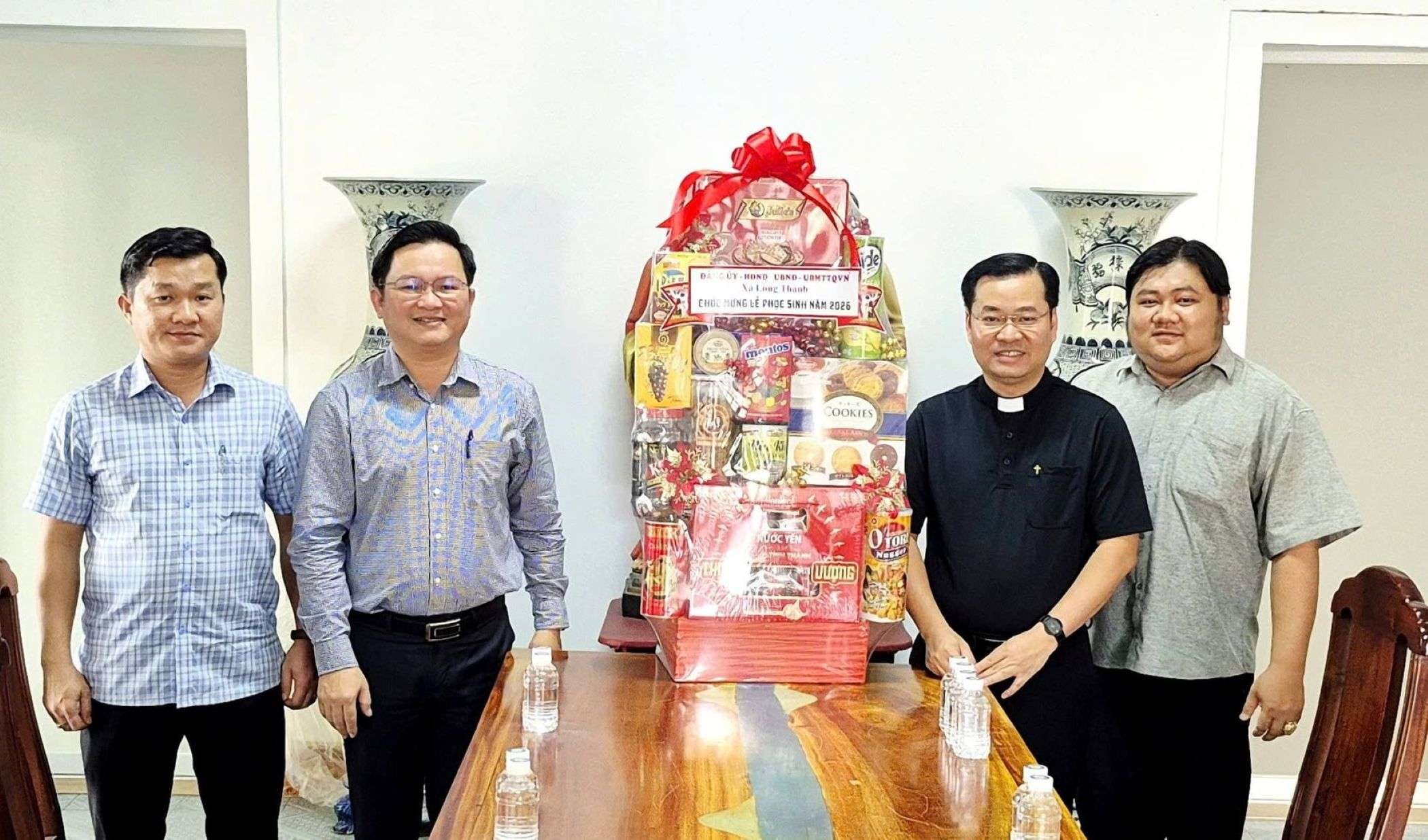 Tỉnh ủy viên, Bí thư Đảng ủy, Chủ tịch HĐND xã Long Thành Nguyễn Hữu Nguyên thăm, tặng quà chúc lễ phục sinh của đồng bào công giáo trên địa bàn. Ảnh: ĐPCC