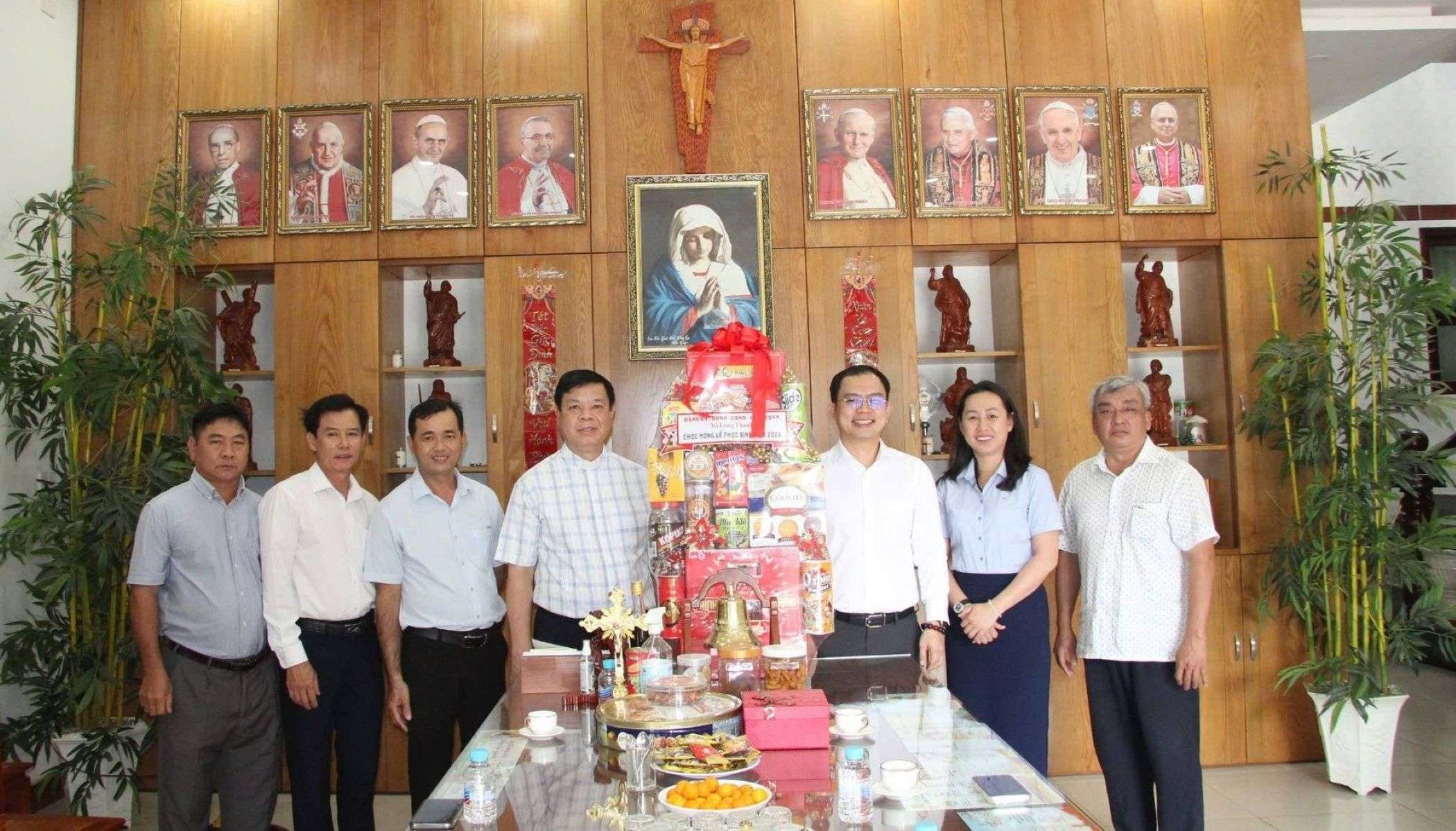 Phó Bí thư Đảng ủy, Chủ tịch UBND xã Lê Hoàng Sơn thăm, tặng quà chúc mừng lễ Phục sinh tại các cơ sở Công giáo trên địa bàn. Ảnh: ĐPCC