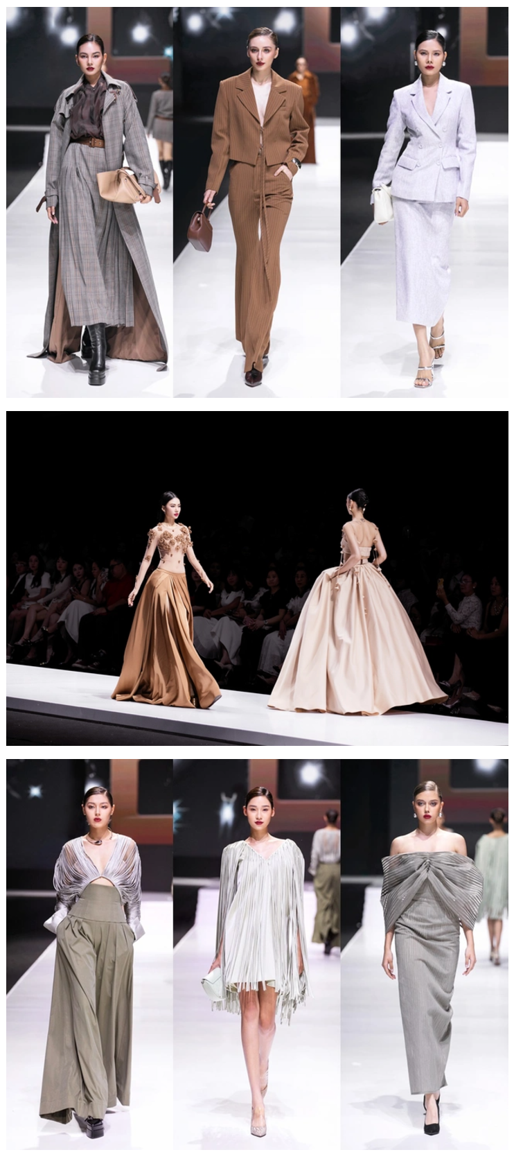Ba bộ sưu tập ấn tượng được tập trung làm nổi lên thông điệp thương hiệu đẳng cấp, sang trọng và khác biệt trên nền tảng những kiểu dáng mang tính ứng dụng cao. Xuất phát điểm từ những chất liệu quen thuộc như: voan, vải tweed, da, nhung, lụa… cùng với đó là kiểu dáng quen thuộc như áo khoác dáng dài, blazer, váy liền, sơ mi… nhưng qua sự sáng tạo của các NTK, mỗi mẫu thiết kế lại trở nên khác biệt và mới lạ hơn.