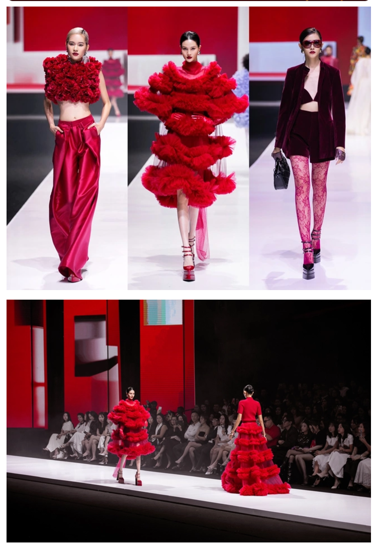 Không chỉ khởi động xu hướng Thu Đông về chất liệu, kiểu dáng, BST của Elise còn có sự chuyển sắc ấn tượng từ những sắc độ của đỏ, nâu, ghi… kết hợp với sự rực rỡ của sắc đỏ, tất cả được ứng dụng khéo léo và uyển chuyển đầy chất nghệ thuật trong cách chơi màu, biến concept này là điểm sáng khác biệt của show diễn.
