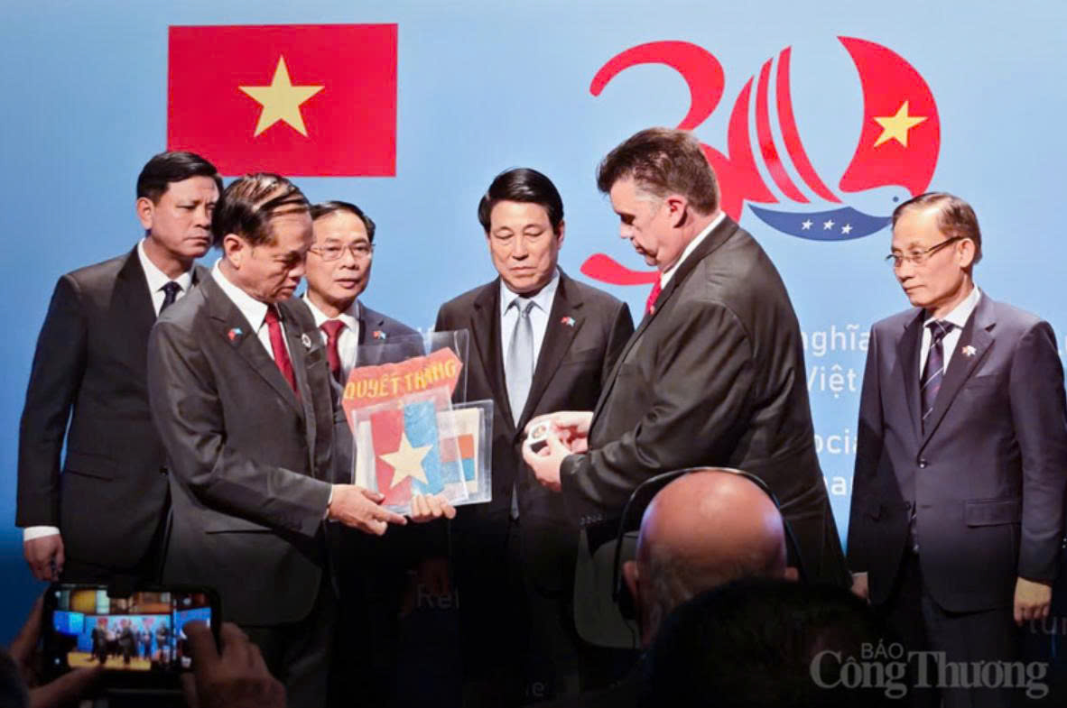 Với sự chứng kiến của Chủ tịch nước Lương Cường, đại diện đoàn cựu chiến binh Việt Nam tiếp nhận kỷ vật từ các cựu binh Hoa Kỳ