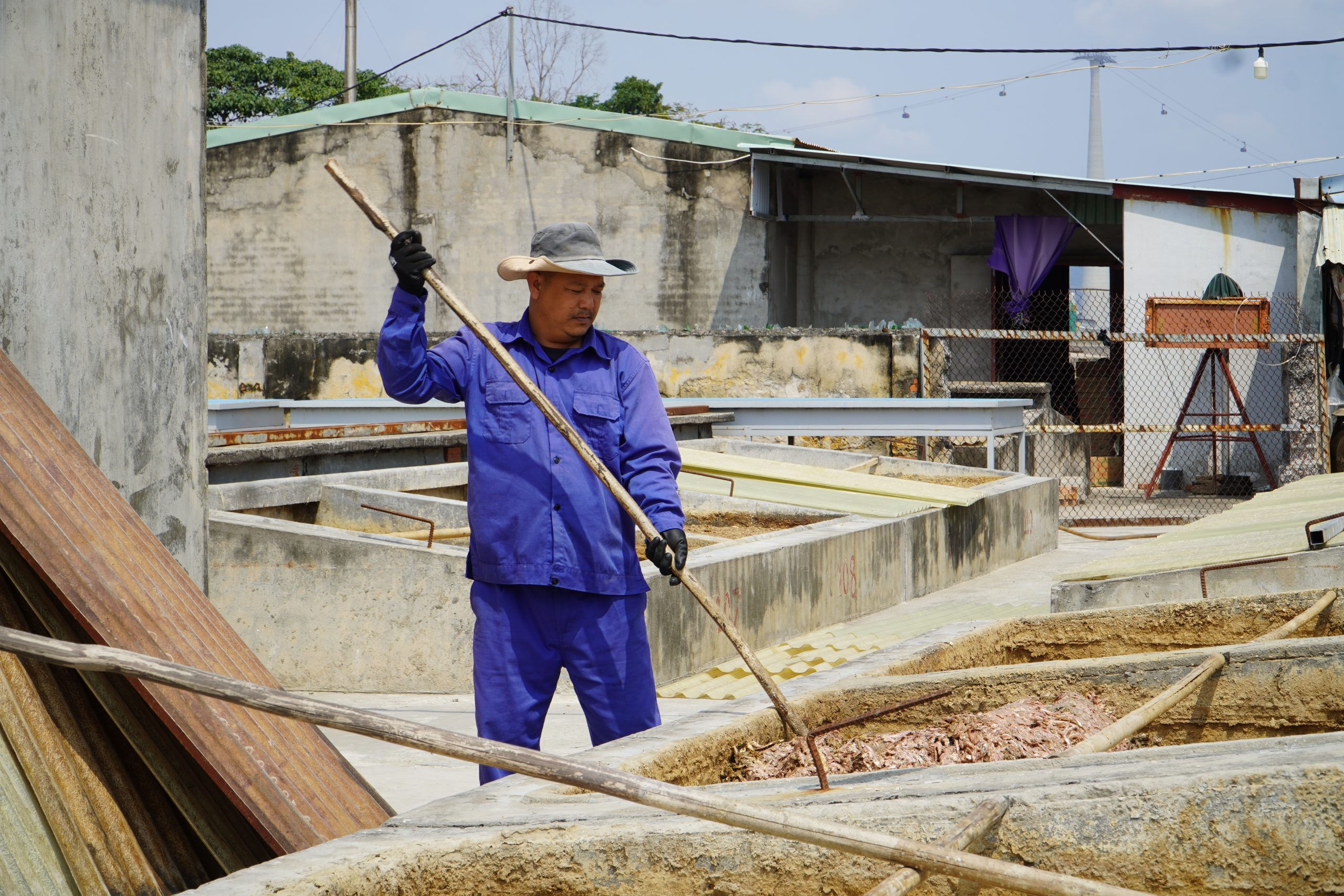 Người làm mắm dùng mái chèo gỗ đảo chượp, giúp nguyên liệu phân hủy đồng đều trong quá trình ủ.