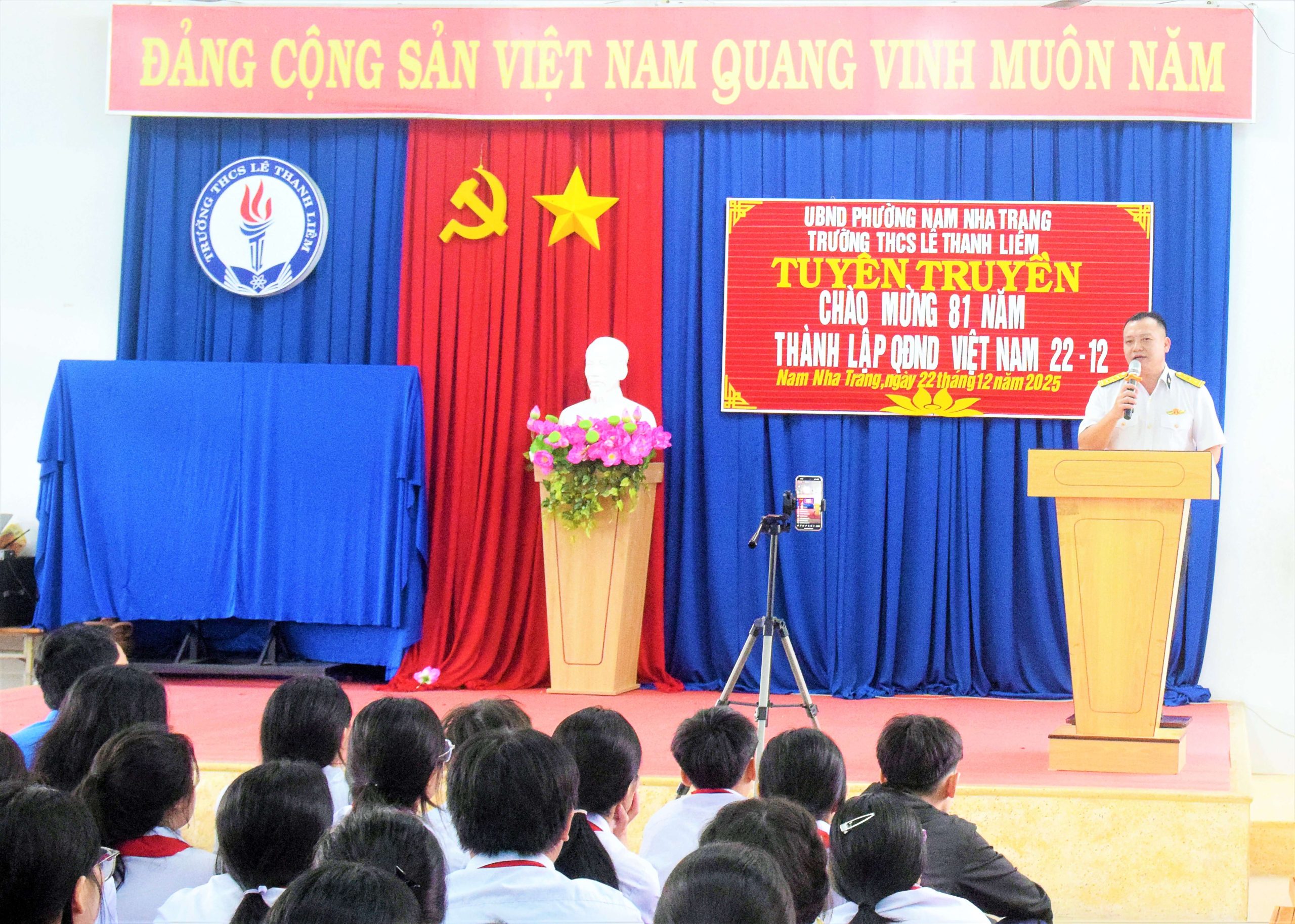 Cùng ngày, tại Trường Tiểu học Phước Long 2, Trường Trung học cơ sở Lê Thanh Liêm (Phường Nam Nha Trang), báo cáo viên của Học viện Hải quân đã thông tin cho giáo viên, học sinh về lịch sử, quá trình xây dựng, chiến đấu và trưởng thành của QĐND Việt Nam và ý nghĩa Ngày hội Quốc phòng toàn dân; Truyền thống Quân chủng Hải quân và Học viện Hải quân trong sự nghiệp bảo vệ chủ quyền biển, đảo của Tổ quốc.