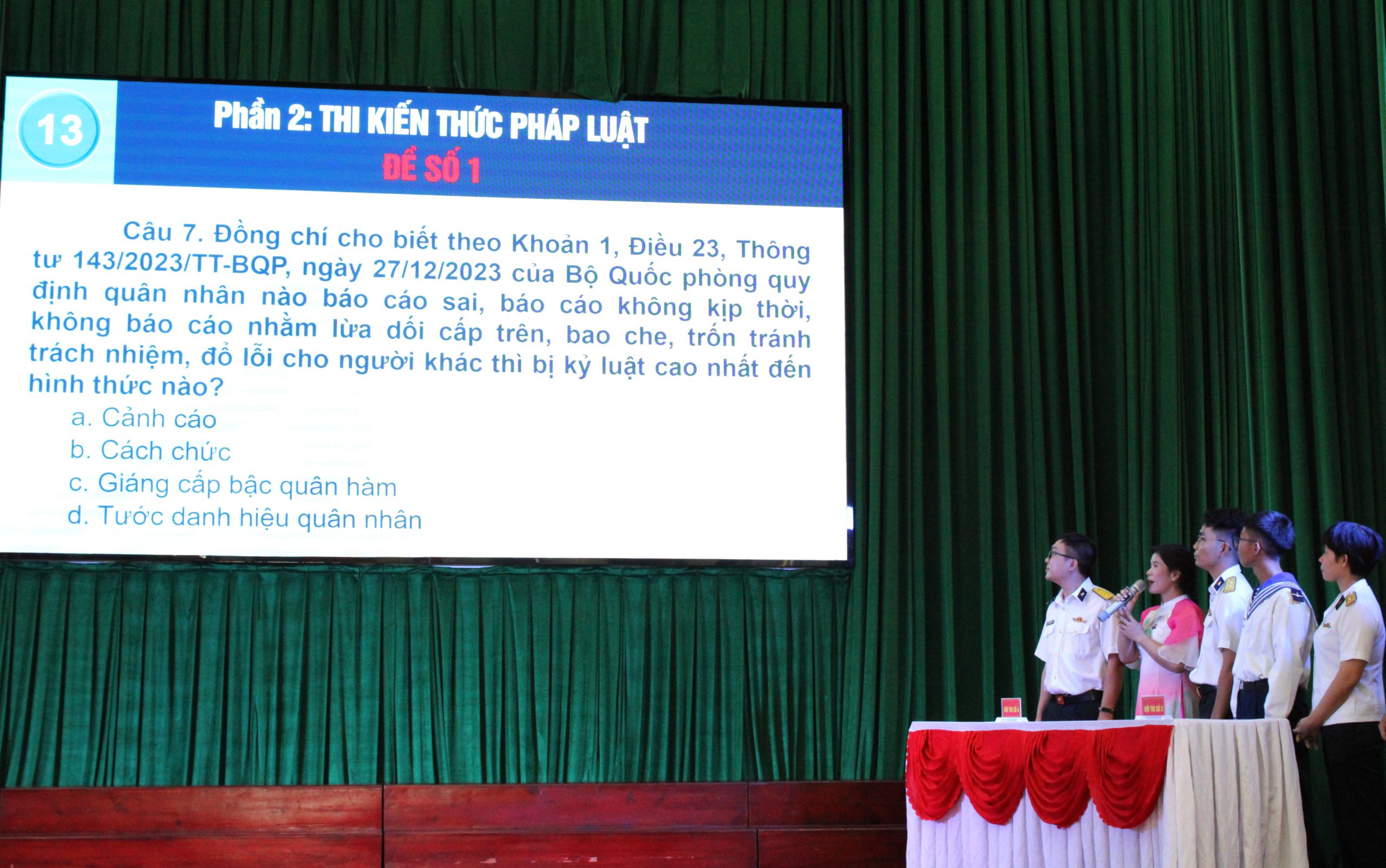 Hội thi là sân chơi lành mạnh, bổ ích, nhằm phát huy tính chủ động, tinh thần sáng tạo, dân chủ của mọi quân nhân trong việc chấp hành nghiêm pháp luật Nhà nước, kỷ luật Quân đội, chỉ thị, quy định của Quân chủng, Vùng, đơn vị. Bên cạnh đó, tiếp tục đa dạng hóa các hình thức phổ biến, giáo dục pháp luật, bảo đảm sự kết hợp hài hòa giữa hình thức truyền thống và những hình thức mới đang được áp dụng có hiệu quả trong thực tiễn bảo đảm phong phú, sinh động, thu hút mọi cán bộ, chiến sĩ tham gia, hưởng ứng tích cực, góp phần hoàn thành tốt nhiệm vụ được giao, đáp ứng yêu cầu, nhiệm vụ bảo vệ chủ quyền biển, đảo của Tổ quốc trong tình hình mới.