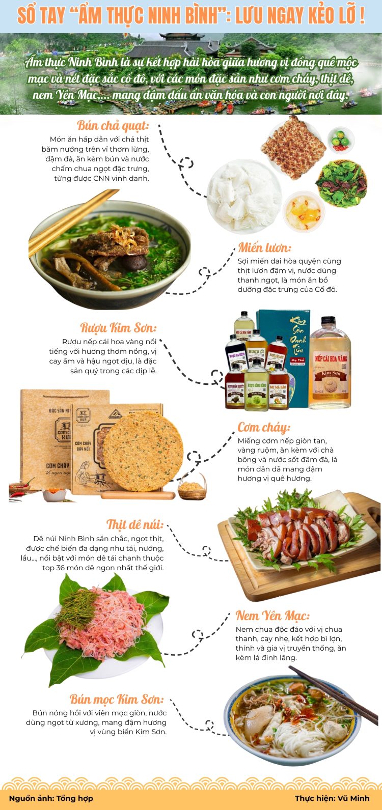 - Ninh Bình không chỉ níu chân du khách bởi nhiều cảnh quan kỳ vĩ của thiên nhiên mà còn "gây thương nhớ" bởi một nền ẩm thực độc đáo, đậm đà bản sắc. Từ những món ăn dân dã đến đặc sản trứ danh, mỗi hương vị nơi đây đều ẩn chứa câu chuyện văn hóa riêng.