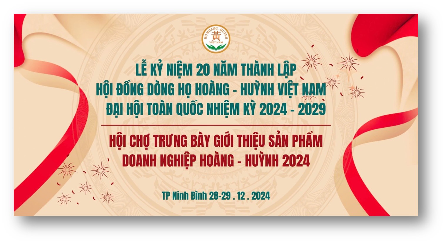 Ngày 28-29/12/2024, Hội đồng Dòng họ Hoàng-Huỳnh Việt Nam tổ chức Lễ Kỷ niệm 20 thành lập và Đại hội Đại biểu toàn quốc Nhiệm kỳ 2024-2029 tại khách sạn Hoàng Sơn – Địa chỉ: Số 98 – Đường Trịnh Tú – P. Ninh Khánh – TP. Ninh Bình, Tỉnh Ninh Bình. Hội đồng Dòng Họ Hoàng-Huỳnh thông tin về sự kiện trọng đại này đến bà con dòng họ trong nước, nước ngoài biết, về dự.
