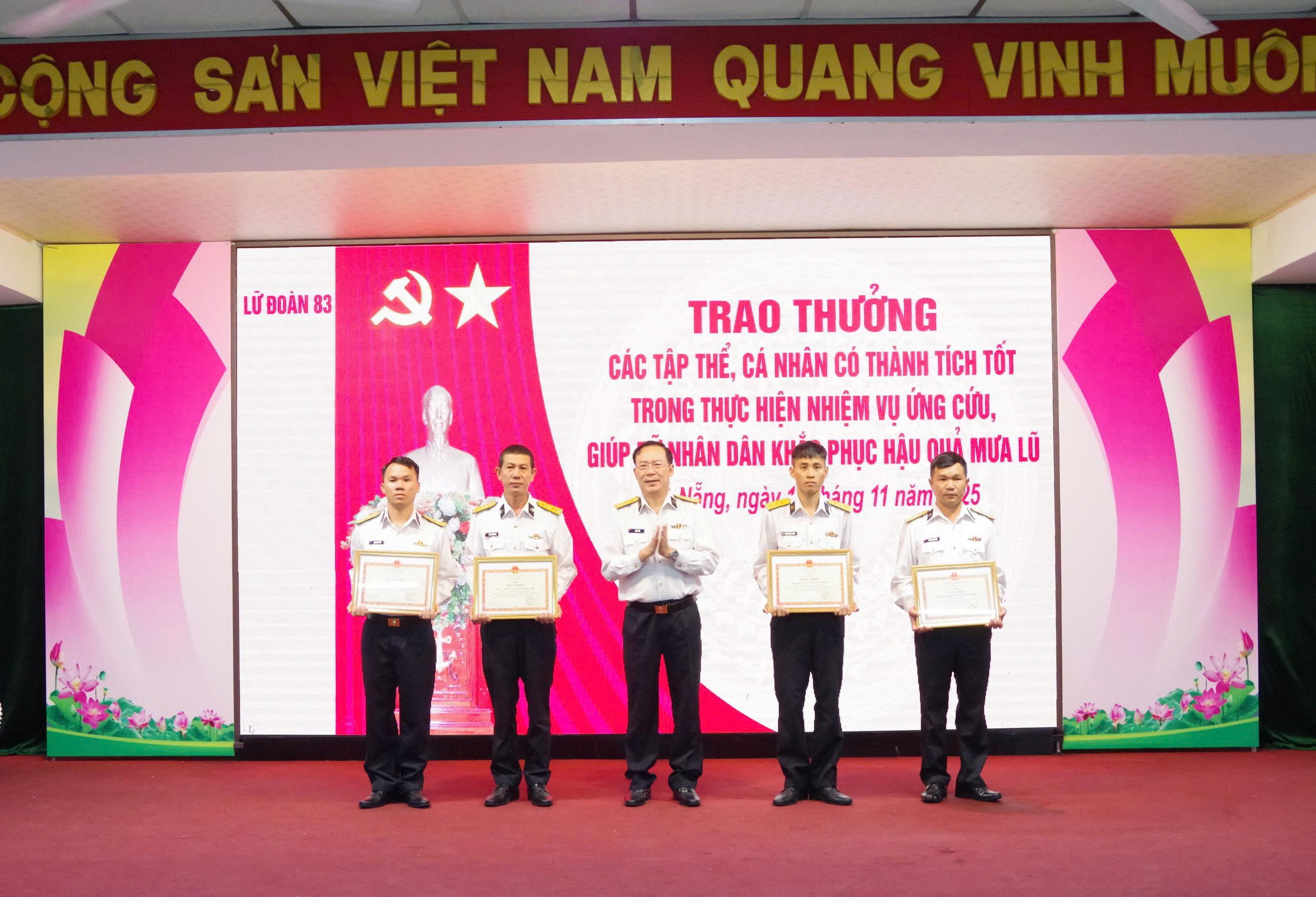 Dịp này, Đảng ủy, chỉ huy Lữ đoàn 83 đã báo cáo tóm tắt kết quả thực hiện nhiệm vụ ứng cứu, hỗ trợ nhân dân khắc phục hậu quả mưa lũ và cơn bão số 13, tặng giấy khen cho các tập thể, cá nhân có thành tích tốt. Theo đó, Lữ đoàn đã huy động hàng trăm cán bộ, chiến sĩ cùng phương tiện, vật chất, lương thực, thực phẩm ứng cứu, giúp đỡ nhân dân trong và sau khi lũ rút, đồng thời giúp nhân dân khắc phục hậu quả bão số 13. Lữ đoàn được Thường vụ Đảng ủy, BTL Quân chủng Hải quân biểu dương và khen thưởng.