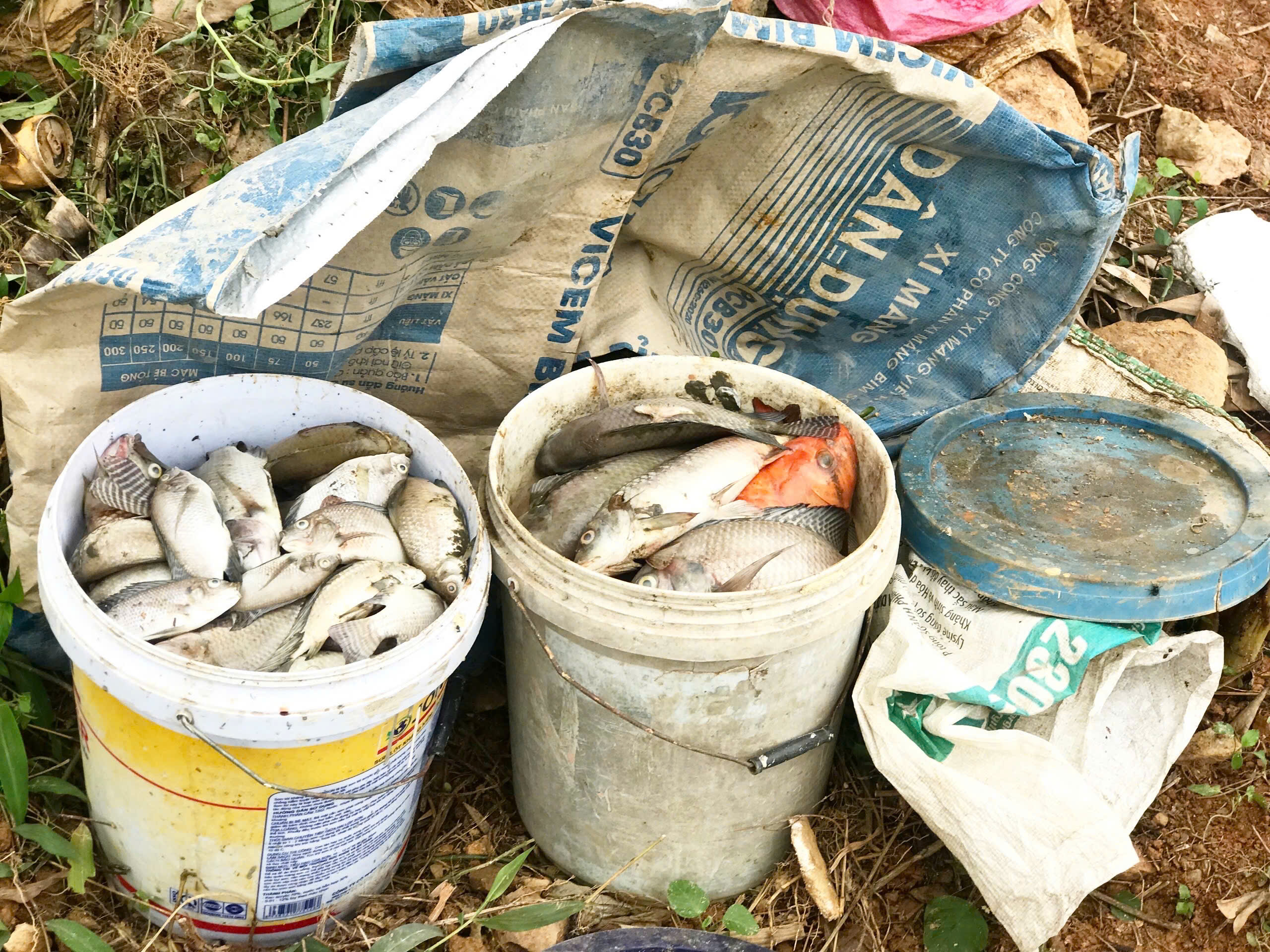Người dân sinh sống gần suối đang tiến hành thu gom cá chết để đem về ủ làm phân hữu cơ, chăm bón cho cây trồng.