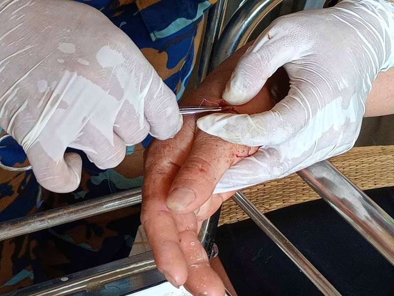 Tiến hành khâu vết thương cho ngư dân.