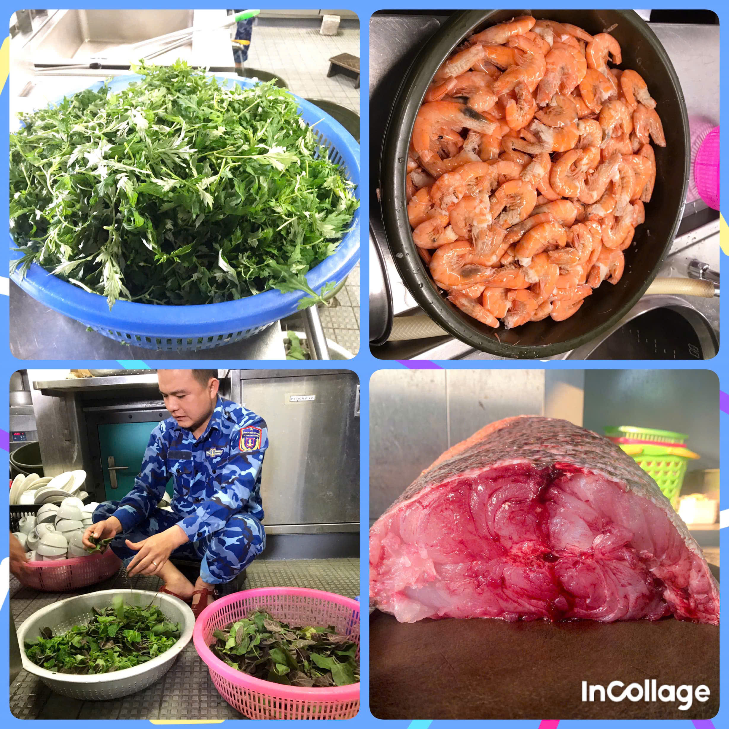Mỗi ngày, tổ nấu ăn phục vụ hơn 100 suất cơm, từ mờ sáng đến tối muộn. Thực phẩm luôn được bảo quản tươi ngon, đảm bảo trong suốt chuyến đi dài ngày. Thật ngạc nhiên khi nhìn thấy những rổ rau vẫn xanh tươi như vừa hái ở vườn ra được các chiến sĩ nhặt gọn và rửa sạch, đang để cho ráo nước trước khi chế biến. Với nụ cười hiền khô, đồng chí thượng uý chuyên nghiệp Nguyễn Minh Tú, tổ trưởng tổ nấu ăn trên tàu chia sẻ bí quyết giữ nguyên liệu thực phẩm: “Rau xanh và các thực phẩm khác khi đem lên tàu chúng tôi tiến hành sơ chế, rửa sạch, để khô ráo và chia vào các túi theo khẩu phần mỗi bữa ăn trên tàu rồi mới cho vào tủ bảo quản theo đúng nhiệt độ yêu cầu cho từng loại thực phẩm. Làm như vậy để đảm bảo giữ nguyên được dinh dưỡng trong từng nguyên liệu và vẫn tươi ngon như mới”. Đồng chí Tú nói thêm: “Chúng tôi coi gian bếp là mặt trận riêng của mình. Dù không trực tiếp tuần tra, truy đuổi tàu vi phạm, nhưng mỗi bữa ăn ngon là một cách tiếp sức cho đồng đội giữ vững tay lái, chắc tay súng”.