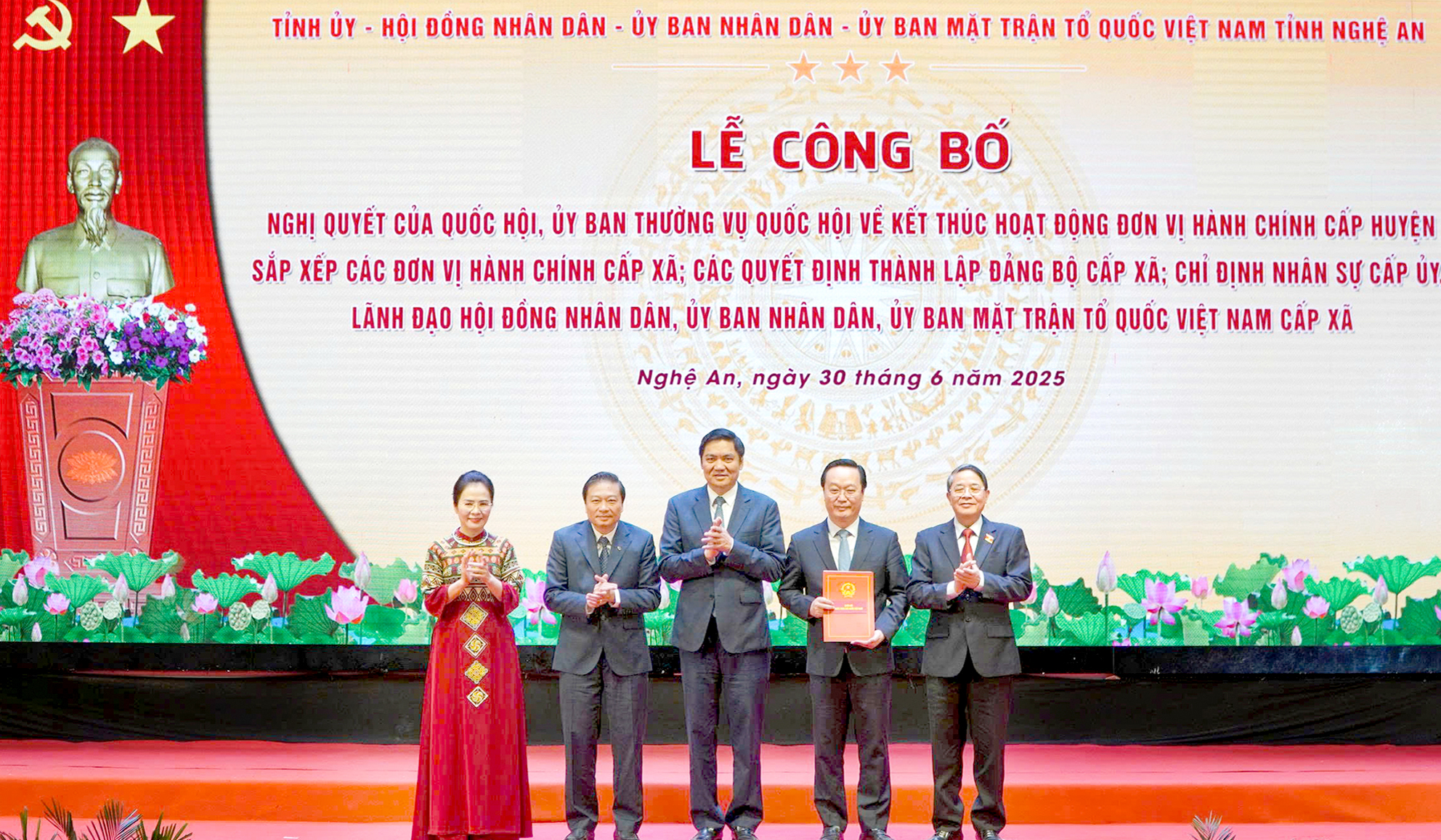 Tại Nghệ An:  Ban tổ chức đã công bố Nghị quyết số 203/2025/QH15 của Quốc hội về sửa đổi, bổ sung một số điều của Hiến pháp nước Cộng hòa xã hội chủ nghĩa Việt Nam (trong đó quy định chính thức kết thúc hoạt động của đơn vị hành chính cấp huyện từ 01/7/2025); Nghị quyết số 1678/NQ-UBTVQH15, ngày16/6/2025 của Ủy ban Thường vụ Quốc hội về sắp xếp các đơn vị hành chính cấp xã của tỉnh Nghệ An năm 2025.