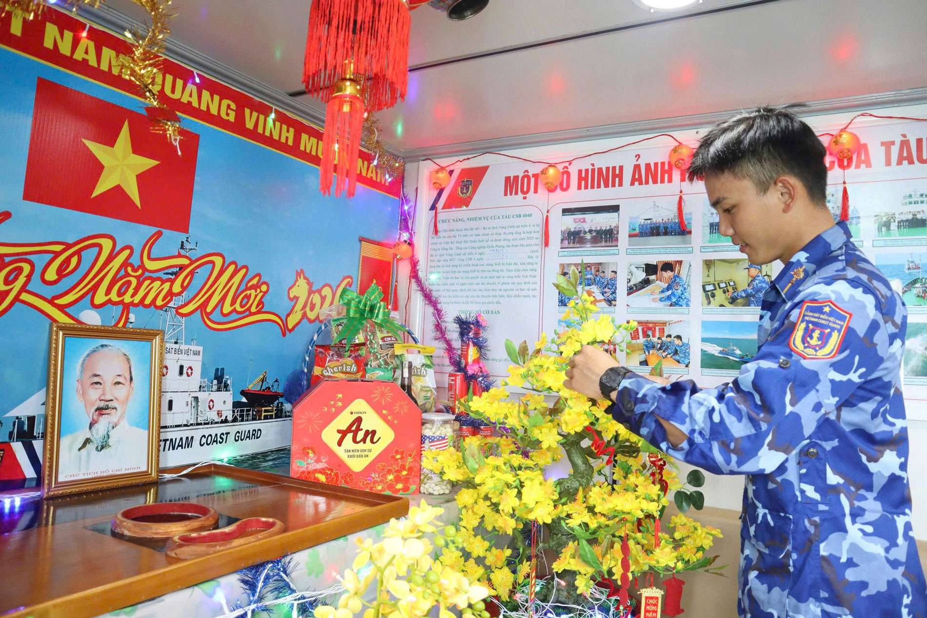 Trong phòng sinh hoạt chung, mùa xuân đến giản dị. Một cành mai nhỏ được nâng niu mang từ đất liền ra, vài câu đối đỏ dán cạnh phòng trực, nồi bánh chưng nghi ngút khói mà anh em thay nhau canh lửa sau mỗi ca tuần tra. Giữa mênh mông sóng nước, không khí bỗng trở nên ấm áp đến lạ như mang theo hơi thở từ quê nhà.