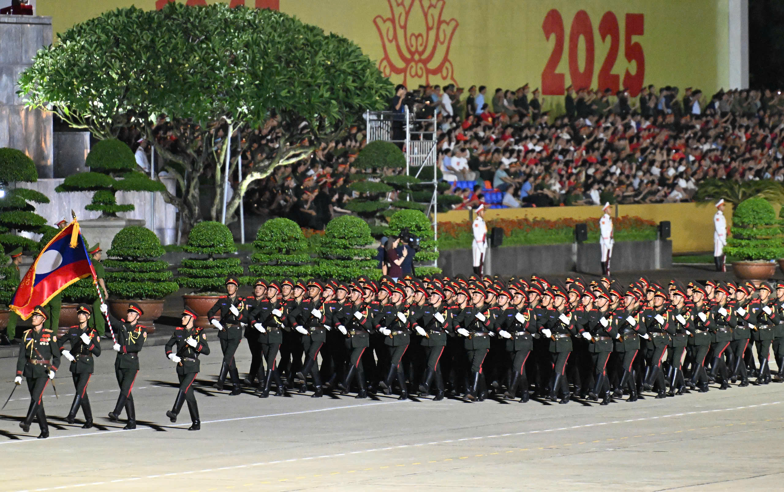 Khối sĩ quan Quân đội nhân dân Lào tiến vào khu vực lễ đài tại buổi tổng hợp luyện tối 21-8.