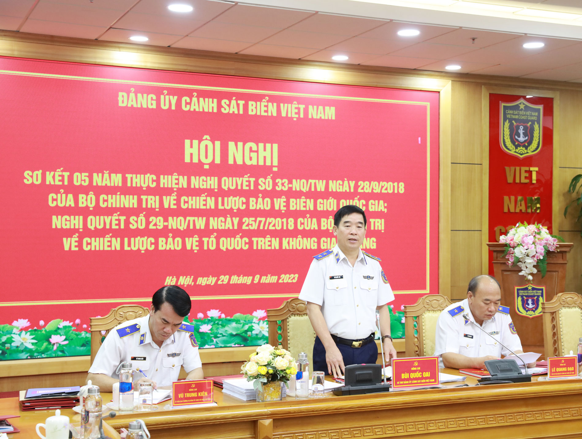- Sáng 29/9, Đảng ủy Cảnh sát biển Việt Nam tổ chức Hội nghị Sơ kết 5 năm thực hiện Nghị quyết số 33-NQ/TW ngày 28/9/2018 của Bộ Chính trị về Chiến lược bảo vệ biên giới quốc gia và 5 năm thực hiện Nghị quyết số 29-NQ/TW ngày 25/7/2018 của Bộ Chính trị về Chiến lược bảo vệ Tổ quốc trên không gian mạng. Trung tướng Bùi Quốc Oai - Bí thư Đảng ủy, Chính ủy Cảnh sát biển dự và chủ trì hội nghị.