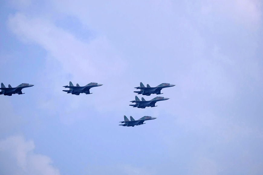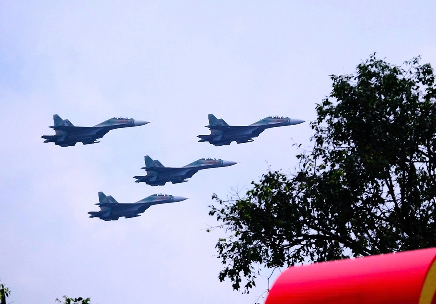 Theo kế hoạch, biên đội Su-30MK2 xuất phát, vượt qua trung tâm Hà Nội rồi đồng loạt tách khối thành nhiều hướng, tạo nên những đội hình uyển chuyển, đẹp mắt nhưng cũng đầy khí thế. Mỗi động tác, mỗi đường bay đều được tính toán chính xác, thể hiện trình độ làm chủ khí tài hiện đại của phi công Việt Nam.