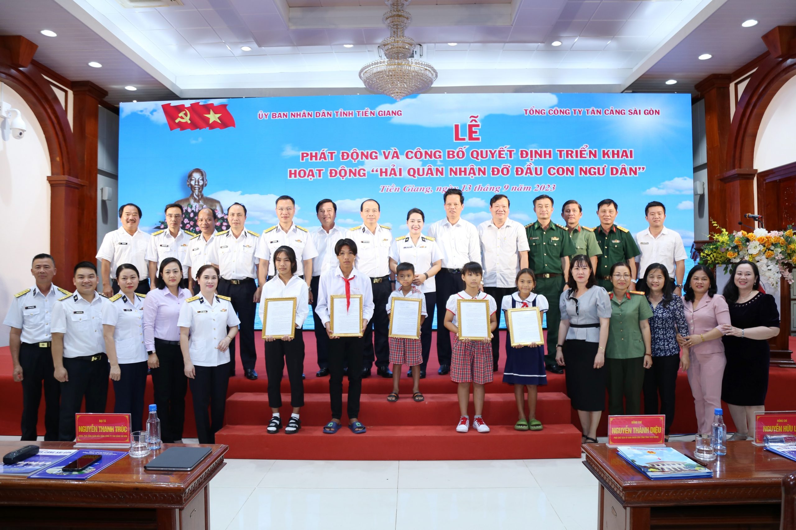 Tại buổi lễ, Đại tá Nguyễn Thanh Trúc, Phó Tổng giám đốc Tổng Tổng Công ty Tân Cảng Sài Gòn, cho biết: hoạt động “Hải quân nhận đỡ đầu con ngư dân” là nội dung mới, được Quân chủng Hải quân lần đầu tiên triển khai với mong muốn hỗ trợ, chăm sóc, động viên, nuôi dưỡng con ngư dân ở tuổi vị thành niên mồ côi, không nơi nương tựa có điều kiện phát triển toàn diện, góp phần chia sẻ khó khăn với hậu phương gia đình ngư dân. Qua đó, góp phần củng cố, tăng cường thế trận quốc phòng toàn dân, thắt chặt tình đoàn kết quân dân, giúp ngư dân yên tâm vươn khơi, bám biển, khai thác hải sản gắn với bảo vệ vững chắc chủ quyền biển, đảo của Tổ quốc. Chương trình cũng thể hiện nét đẹp văn hóa nghĩa tình của Tổng công ty Tân Cảng Sài Gòn và tăng cường mối quan hệ đoàn kết, gắn bó giữa Tổng Công ty Tân Cảng Sài Gòn với tỉnh Tiền Giang.
