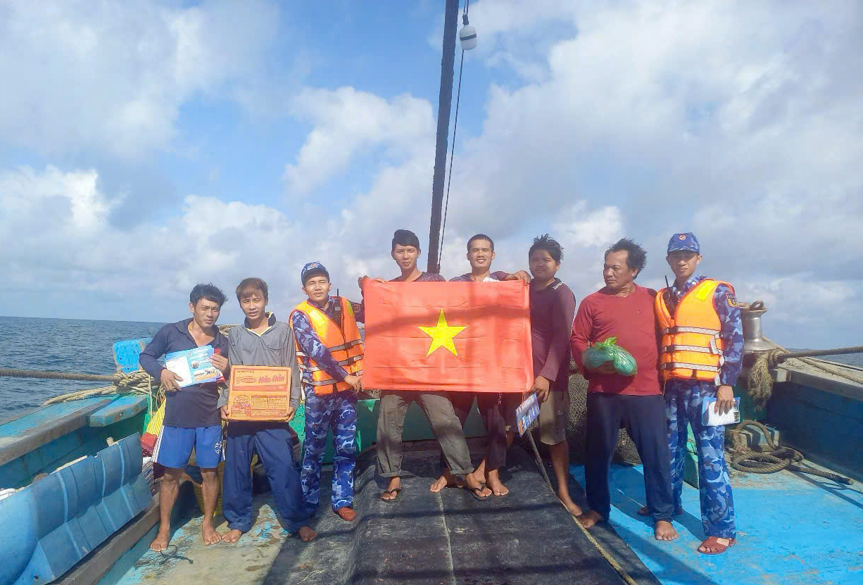 Trong quá trình thực hiện nhiệm vụ trực Tết trên biển từ ngày 11/2 (24 Tết) đến hôm nay (29 Tết), tổ công tác của tàu CSB 4036 đã hạ xuồng cơ động đến 9 tàu cá của bà con ngư dân các địa phương đang đánh bắt hải sản xuyên qua Tết để tiến hành tuyên truyền pháp luật cho gần 40 ngư dân, cấp phát 30 tờ rơi “Những điều ngư dân cần biết về chống khai thác IUU”. Nhân dịp chuẩn bị bước sang năm mới Bính Ngọ 2026, tổ công tác đã ân cần động viên, thăm hỏi sức khỏe, tình hình đánh bắt hải sản và trao tặng 10 lá cờ Tổ quốc, bánh kẹo, thuốc chữa bệnh, gạo, mì tôm, rau xanh và nhu yếu phẩm cần thiết cho bà con ngư dân trong phiên biển cuối năm. Bên cạnh đó, tổ công tác đã tuyên truyền cho bà con ngư dân về việc thu gom rác thải sinh hoạt, không vứt rác xuống biển, góp phần bảo vệ môi trường biển.