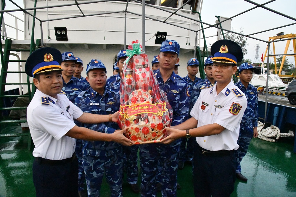 Trước giờ tàu xuất phát đi thực hiện nhiệm vụ, Chỉ huy Hải đoàn 42 cùng chỉ huy các cơ quan, đơn vị tổ chức xuống thăm hỏi, động viên, chúc Tết sớm cán bộ, chiến sĩ tàu CSB 6009.