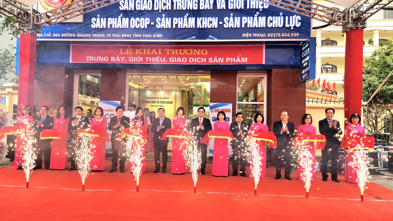 Lãnh đạo Bộ Khoa học và Công nghệ cùng lãnh đạo tỉnh Thái Bình và lãnh đạo sở ban ngành cắt băng khai trương trưng bày, giới thiệu các sản phẩm OCOP, sản phẩm KHCN và sản phẩm chủ lực của tỉnh tại Sàn Giao dịch Công nghệ và Thiết bị Thái Bình.