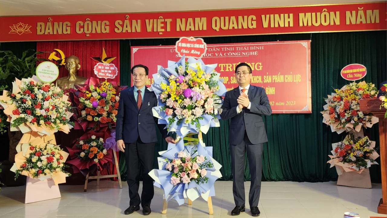 Thứ trưởng Bộ Khoa học và Công nghệ Nguyễn Hoàng Giang tặng hoa chúc mừng.