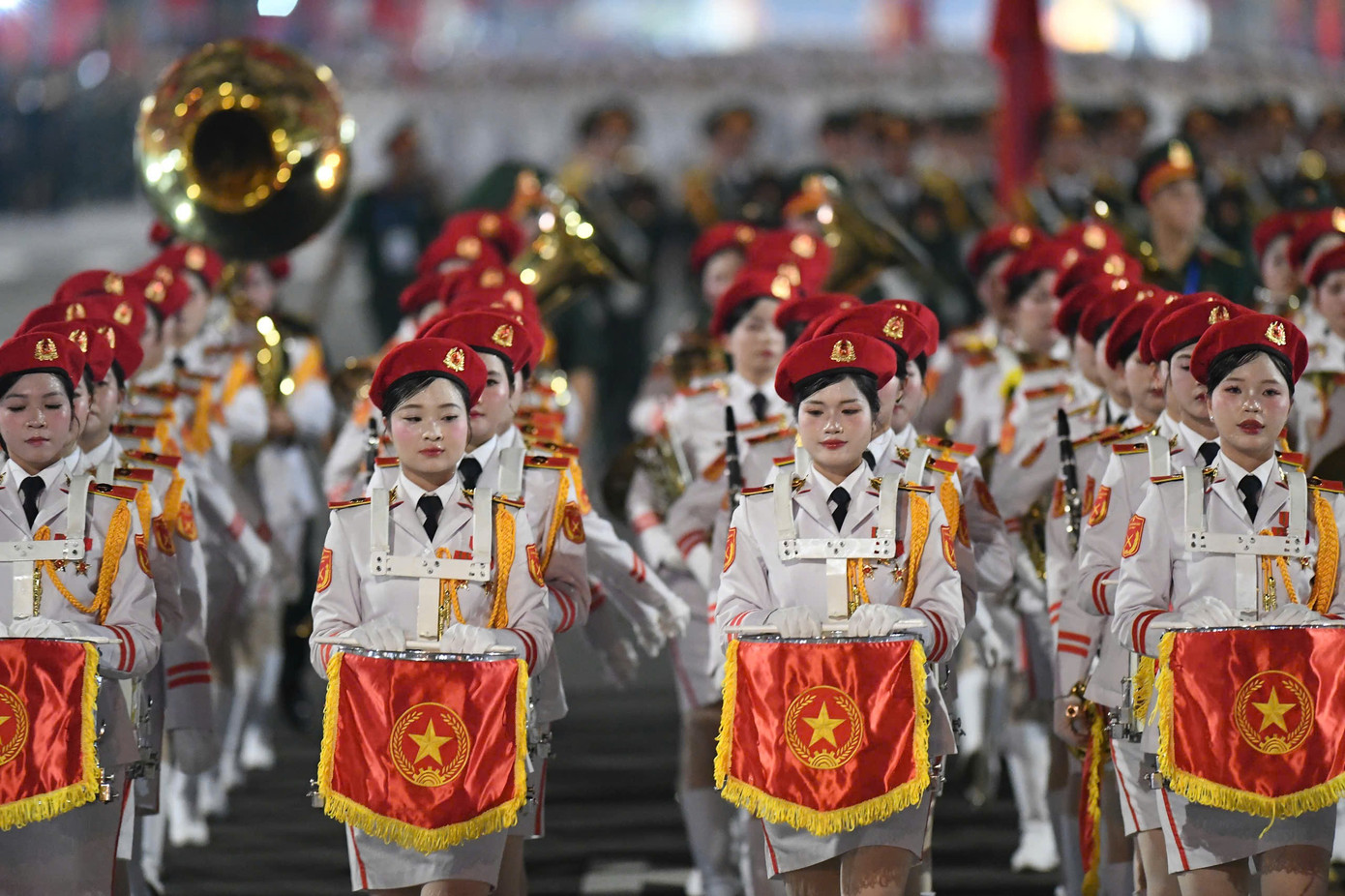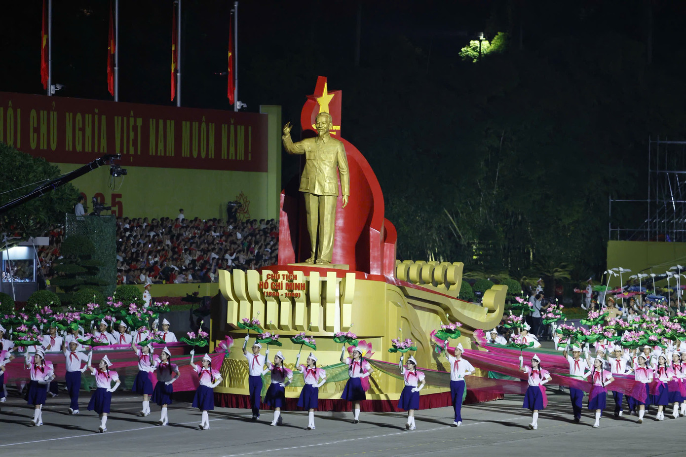 Các khối diễu binh, diễu hành lần lượt tiến qua lễ đài theo nghi thức trang trọng. Đi đầu là Quốc huy đặt trên trống đồng Đông Sơn – biểu tượng độc lập, chủ quyền và nguồn cội văn hóa dân tộc. Tiếp đó là đoàn đại diện 54 dân tộc anh em, khối cờ Đảng, cờ Tổ quốc, đoàn rước chân dung Chủ tịch Hồ Chí Minh và biểu tượng kỷ niệm 80 năm Quốc khánh, tất cả tái hiện sinh động lịch sử hào hùng và khẳng định sức mạnh đại đoàn kết dân tộc.