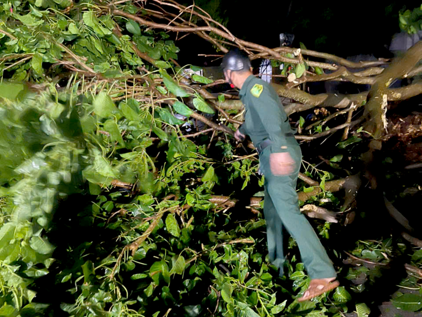 Trong đêm, khoảng 23h30p, tại khu vực ngã tư Voi thuộc địa phận phường Đông Vệ, thành phố Thanh Hóa, 01 nam thanh niên đi xe máy trong lúc gió to, 01 cây ven đường bị đổ và chận lên xe máy của nam thanh niên này khiến xe bị hư hỏng toàn phần, người bị thương nặng.