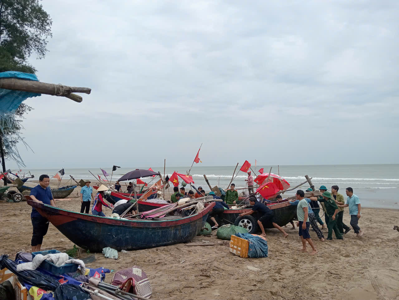 Để ứng phó với bão số 3, Bí thư, Chủ tịch, Công an, cán bộ phường Quảng Cư, thành phố Sầm sơn đang tập trung giúp ngư dân đưa thuyền bè vào nơi tránh trú an toàn