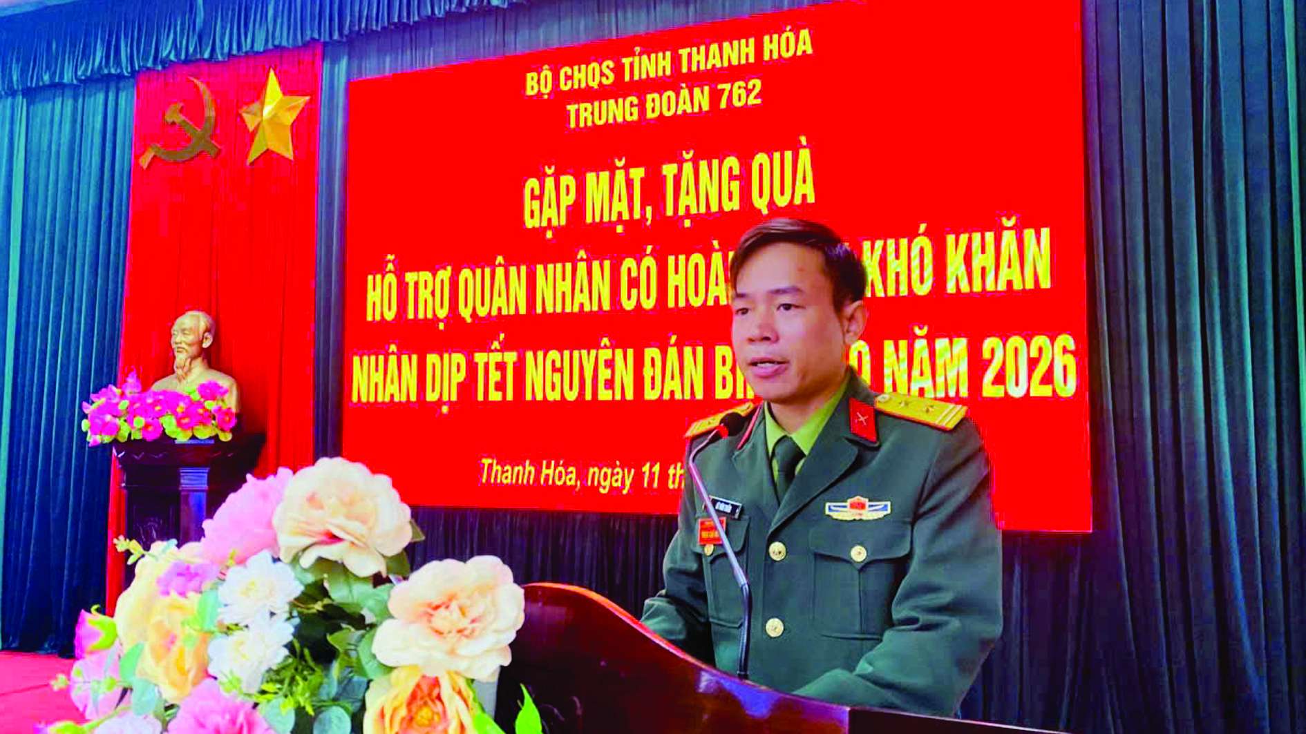 Phát biểu tại buổi trao qùa, đồng chí Trung tá Lê Văn Tuấn, Trung đoàn trưởng Trung đoàn 762 đã ghi nhận, trân trọng và biểu dương những phần quà hôm nay tuy giá trị vật chất không lớn nhưng là tình cảm, sự sẻ chia và trách nhiệm của Đảng ủy, chỉ huy Trung đoàn và các doanh nghiệp dành cho các đồng chí. Đông chí Trung đoàn trưởng mong rằng đây sẽ là nguồn động viên thiết thực, tiếp thêm nghị lực để các đồng chí yên tâm điều trị, giữ vững tinh thần lạc quan, sớm ổn định sức khỏe.
