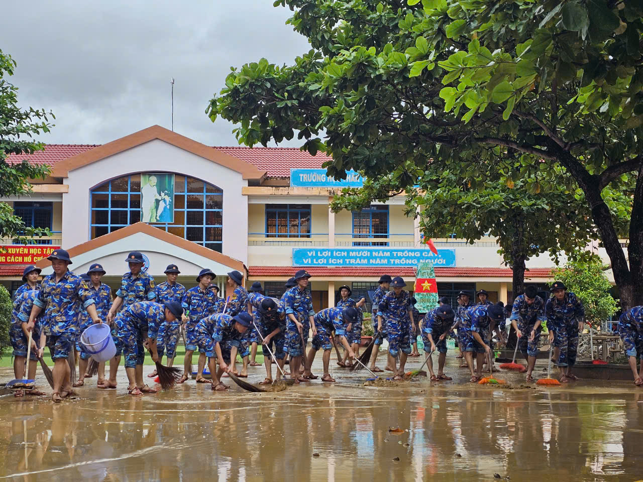Cùng với đó, Học viện Hải quân nỗ lực tham gia hỗ trợ và khắc phục hậu quả sau lũ. Tính đến ngày 23/11, gần 900 cán bộ, học viên đã được huy động hỗ trợ nhân dân, tập trung vào tổng dọn bùn đất, vệ sinh trường học, hỗ trợ y tế và sửa chữa cơ sở hạ tầng. Riêng sáng 23/11, hơn 300 cán bộ, học viên được điều động đến phường Tây Nha Trang, chia thành 15 khu vực để giúp dân dọn dẹp, khơi thông cống rãnh, hỗ trợ thuốc men và ổn định đời sống. Lực lượng quân y Học viện sẵn sàng hỗ trợ người dân ốm đau, cấp thuốc miễn phí, góp phần đảm bảo sức khỏe cộng đồng trong thời gian sau lũ.