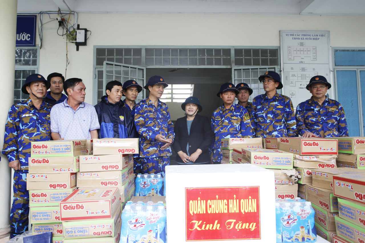 Cùng thời điểm, lực lượng Hải quân tại Khánh Hòa và Đắk Lắk triển khai tổng cộng 2.335 lượt cán bộ chiến sĩ, hàng chục lượt xuồng và xe chuyên dụng. Các đơn vị đã sơ tán 4.828 người đến nơi an toàn, hỗ trợ bảo vệ tài sản cho 11 hộ dân có nguy cơ ngập sâu. Hơn 235 thùng quà, 1.140 suất quà, hàng trăm suất ăn, 150 thùng mì tôm, 1.640 kg lương khô, 500 thùng nước uống, 1000 lít nước ngọt và 40 thùng sữa đã được trao tận tay người dân. Khi nước rút, bộ đội tiếp tục giúp dân vệ sinh 4.500m đường giao thông, nạo vét 3.160m cống rãnh, dọn dẹp 13 trường học, 1 trụ sở UBND và đắp 250m đê chống sạt lở. Quân y Hải quân đã khám và cấp thuốc cho 180 người, phun khử khuẩn hơn 1.300m² nhằm phòng ngừa dịch bệnh.