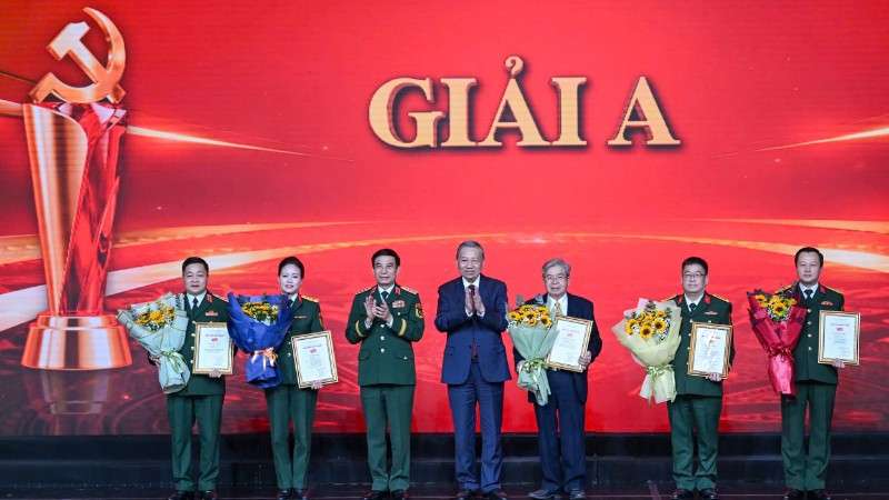 Tổng Bí thư Tô Lâm và Đại tướng Phan Văn Giang, Bộ trưởng Quốc phòng trao giải A tặng các tác giả, nhóm tác giả xuất sắc nhất cuộc thi.