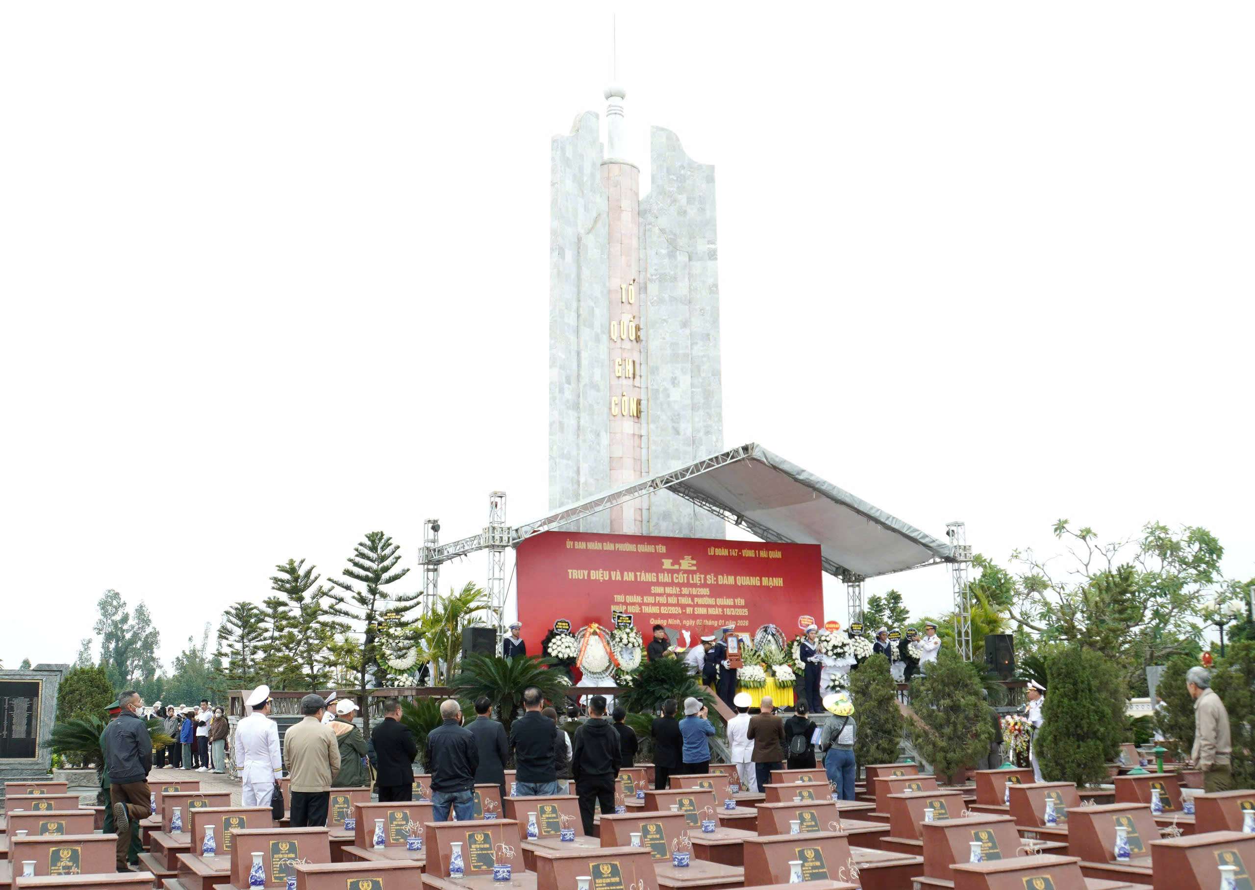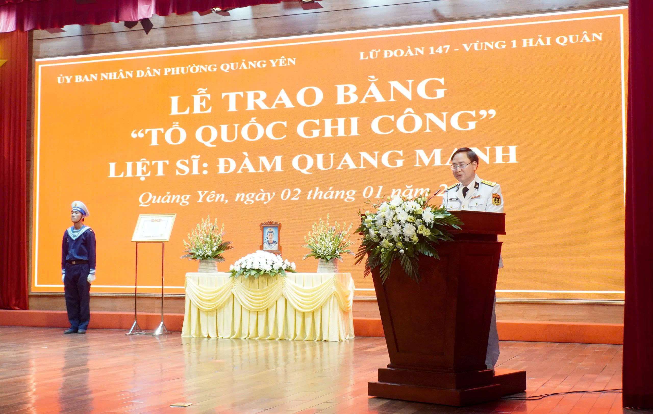 Trong không khí trang nghiêm, xúc động, Chuẩn Đô đốc Vũ Văn Nam – Tư lệnh Vùng 1 Hải quân đã trao Bằng “Tổ quốc ghi công” của Thủ tướng Chính phủ (theo Quyết định số 2705/QĐ-TTg, ngày 12/12/2025) tới thân nhân liệt sĩ Đàm Quang Mạnh.