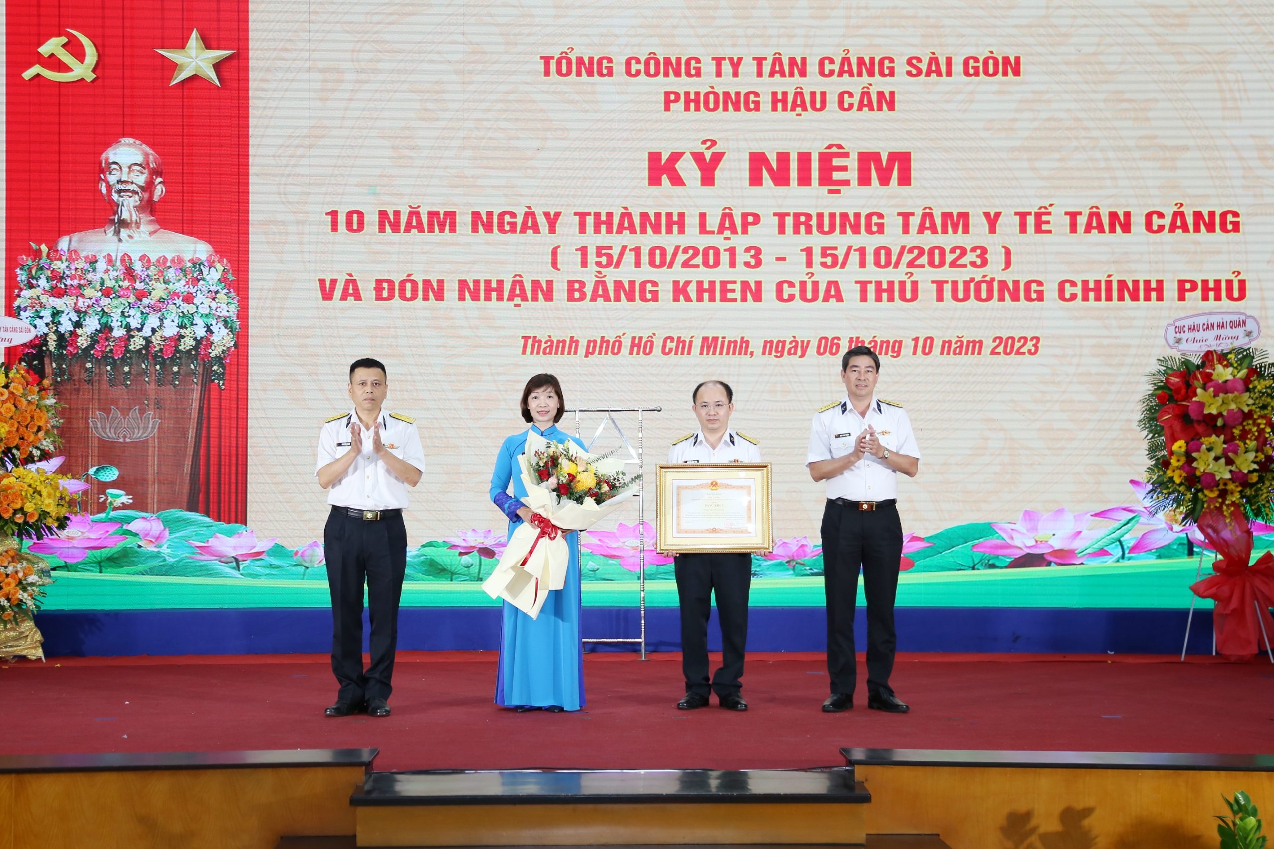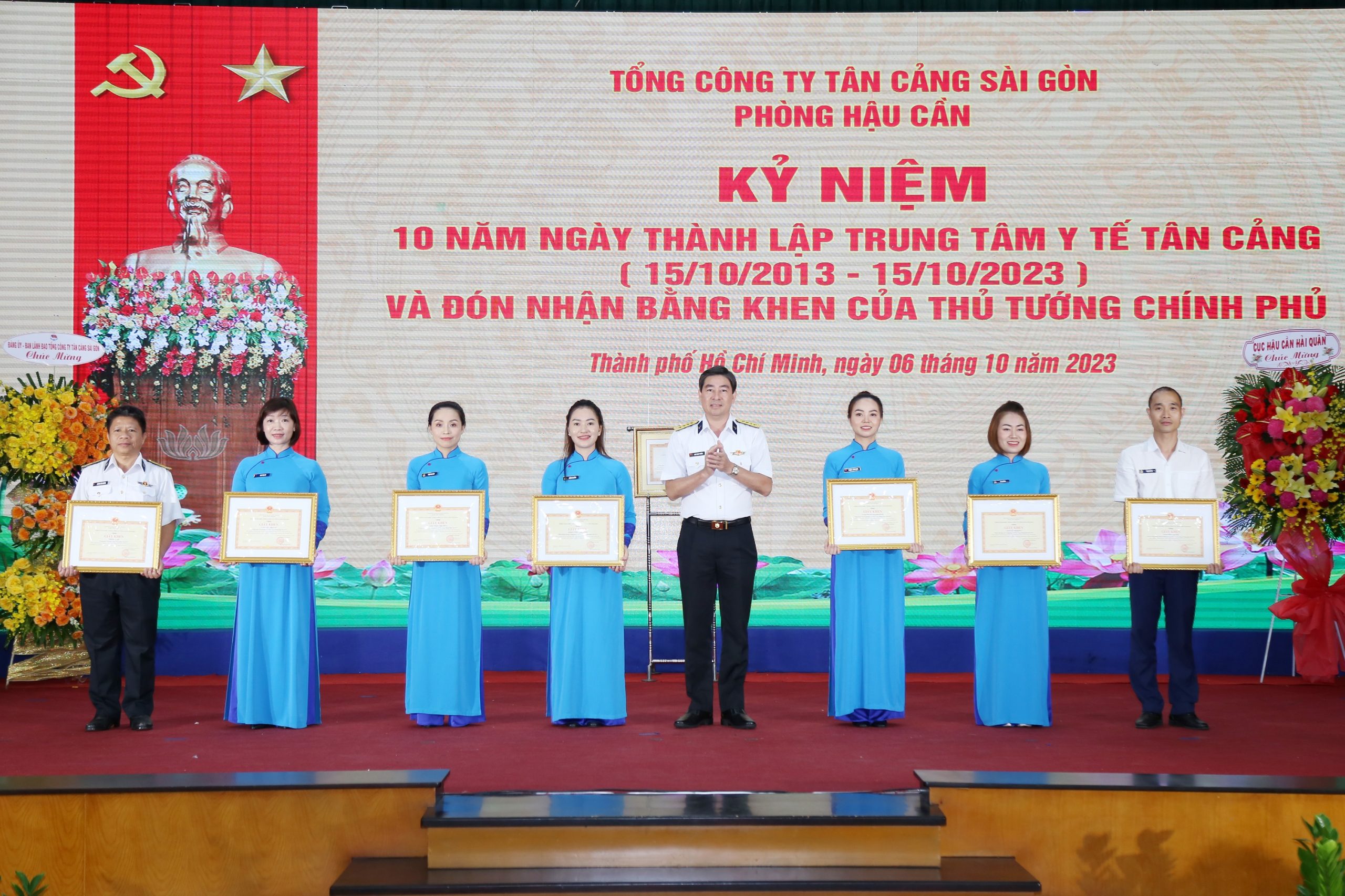 Thừa ủy quyền Thủ tướng Chính phủ, Đại tá Ngô Minh Thuấn (người đúng bên phải) trao Bằng khen cho tập thể Trung tâm Y tế Tân CảngNhờ chủ động, tích cực hợp tác với các bệnh viện tuyến trên, các chuyên gia giỏi, bác sỹ đầu ngành nên TTYT Tân Cảng đã sớm triển khai các kỹ thuật chuyên khoa sâu như nội soi tiêu hóa có tiền mê, nha khoa, vật lý trị liệu… phát hiện sớm, điều trị kịp thời, chất lượng, hiệu quả nhiều bệnh lý tiêu hóa, tim mạch, nội tiết, ung thư tuyến giáp, viêm gan siêu vi B tạo lòng tin và uy tín cao đối với người bệnh. Mục tiêu hướng tới là “Chất lượng, an toàn, hiệu quả và sự hài lòng của người bệnh”, xây dựng TTYT Tân Cảng thực sự trở thành cơ sở khám, chữa bệnh ban đầu uy tín, chất lượng trong khu vực.Mỗi năm, đội ngũ Y, bác sỹ, nhân viên của Trung tâm ngoài khám sức khỏe định kỳ cho hơn 10 nghìn lượt cán bộ, công nhân viên trong Tổng công ty và cán bộ, chiến sỹ các đơn vị Hải quân, các đối tượng chính sách, Câu lạc bộ hưu trí Tân Cảng Sài Gòn. Trung tâm còn khám cho hàng ngàn lượt người dân Phường Cát Lái và huyện Nhơn Trạch, tỉnh Đồng Nai.Đặc biệt, trước diễn biến phức tạp, khó lường của dịch covid-19 trên địa bàn TP. Hồ Chí Minh, TTYT Tân Cảng đã chủ động, tích cực nỗ lực, phối hợp với cơ quan y tế địa phương, Trung tâm y tế dự phòng Quân đội phía Nam, Bệnh viện Quân dân y miền Đông tổ chức xét nghiệm trên diện rộng cho 258 nghìn lượt người; tích cực tìm nguồn vắc xin để tiêm ngừa cho 100% người lao động của Tổng công ty và các cơ quan quản lý nhà nước, đơn vị vệ tinh, hãng tàu làm việc tại cơ sở Cảng; phối hợp y tế địa phương triển khai 2 khu cách ly tập trung F1, F0 gần cảng Cát Lái…Nhân kỷ niệm 10 năm ngày thành lập, Trung tâm Y tế Tân Cảng vinh dự đón nhận Bằng khen của Thủ tướng Chính phủ. Tổng công ty Tân Cảng Sài Gòn tặng giấy khen cho 1 tập thể và 6 Cá nhân có thành tích xuất sắc.