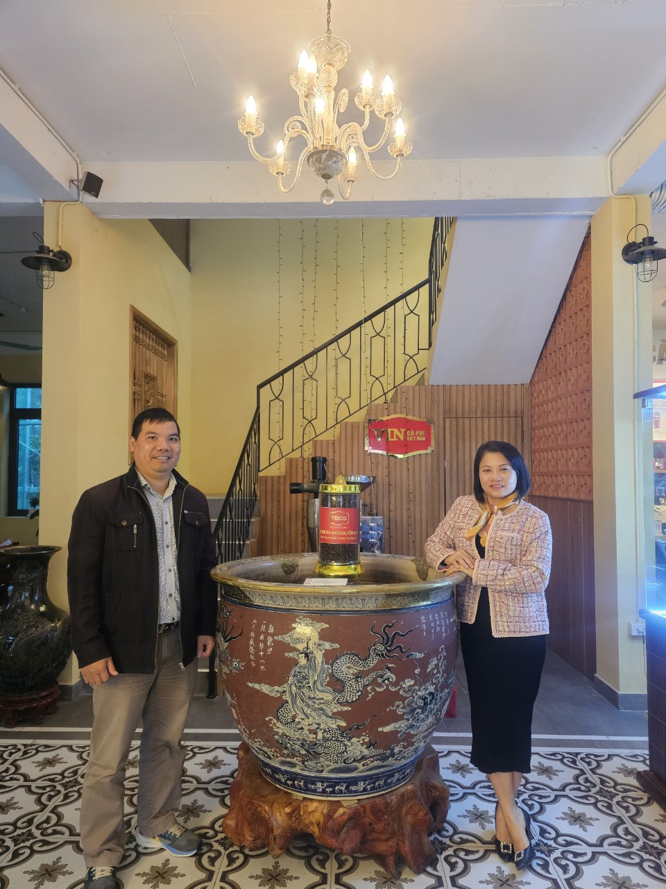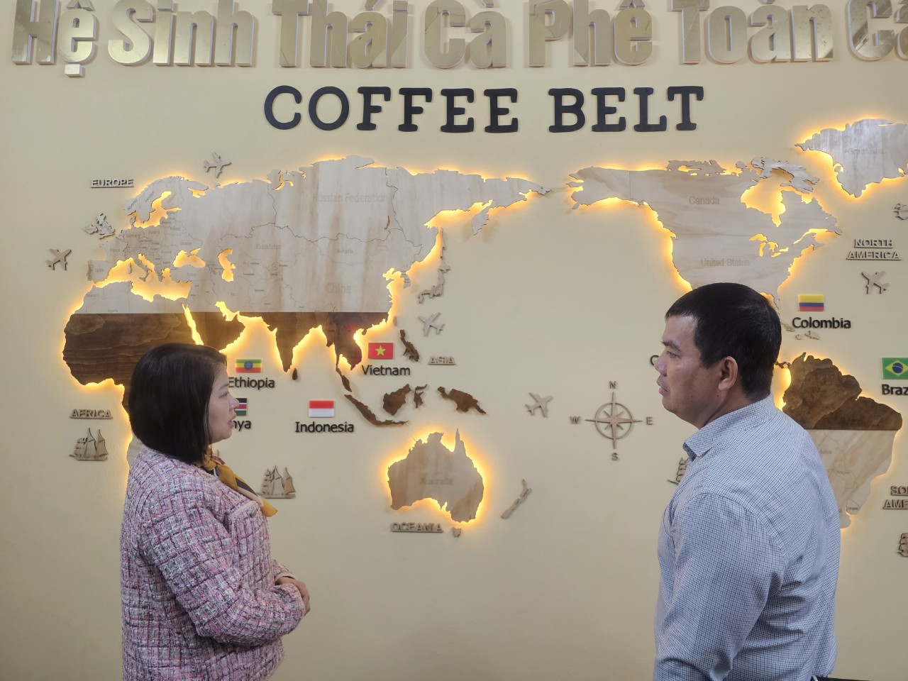 Ông Hoàng Trung Kiên Chủ tịch HĐQT Công ty CP Tập đoàn Vin cafe Việt Nam  giới thiệu các Vùng nguyên liệu cafe trên bản đồ TG với Bà Hoàng Thị Huệ, TBT tạp chí Biển Việt Nam
