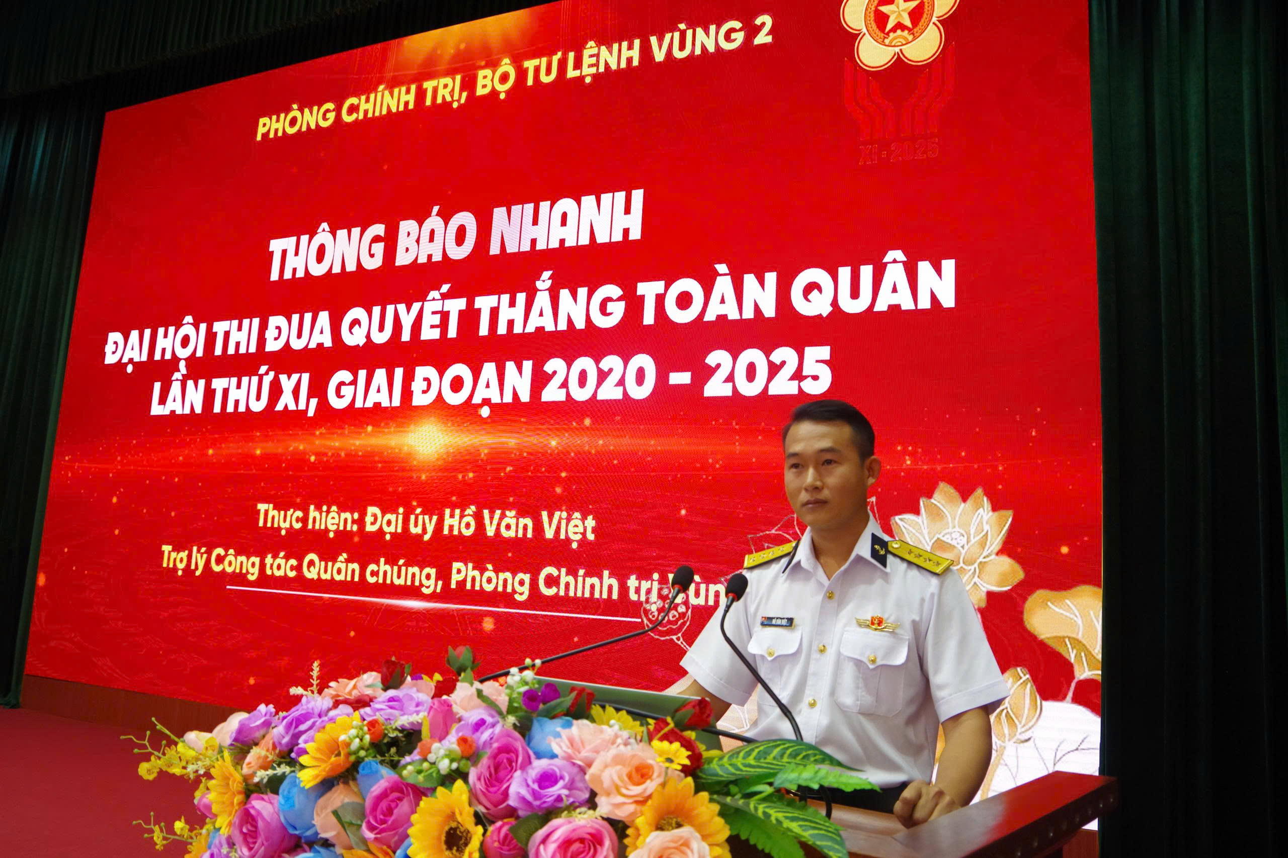 Cũng tại hội nghị, Đại úy Hồ Văn Việt, Trợ lý Công tác Quần chúng, Phòng Chính trị Vùng, thông báo nhanh kết quả Đại hội Thi đua Quyết thắng toàn quân lần thứ XI, giai đoạn 2020-2025.