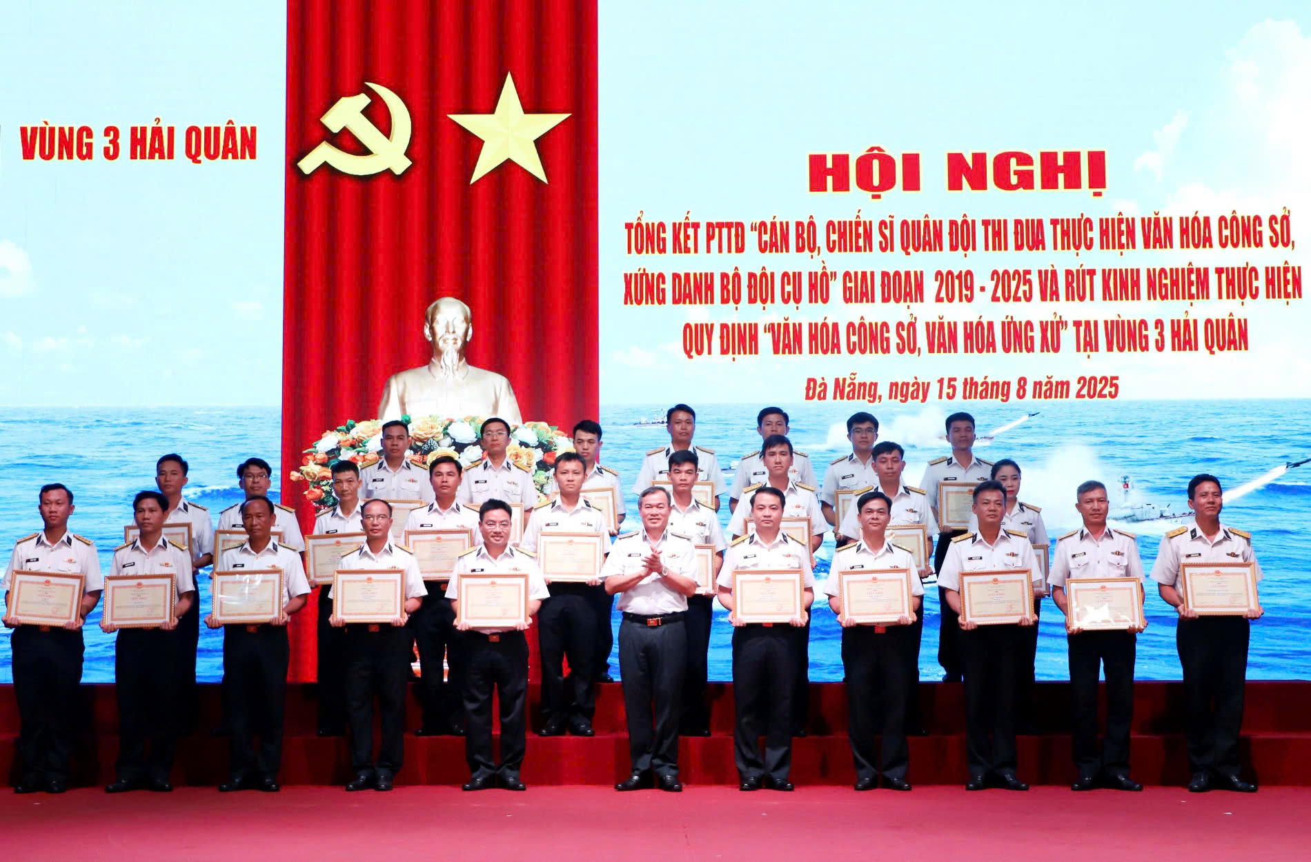 Tạp chí Biển Việt Nam - Sáng 15/8, tại thành phố Đà Nẵng, Bộ Tư lệnh Vùng 3 Hải quân tổ chức Hội nghị Tổng kết phong trào thi đua “Cán bộ, chiến sĩ Quân đội thi đua thực hiện văn hóa công sở, xứng danh Bộ đội Cụ Hồ” giai đoạn 2019 – 2025 và rút kinh nghiệm thực hiện Quy định số 299 “Văn hóa công sở, văn hóa ứng xử” tại Vùng 3 Hải quân. Chuẩn Đô đốc Nguyễn Đăng Tiến, Bí thư Đảng ủy, Chính ủy Vùng dự và chủ trì hội nghị. Cùng tham dự có các đồng chí trong Thường vụ Đảng ủy, Thủ trưởng Bộ Tư lệnh Vùng, thủ trưởng các cơ quan, đơn vị trực thuộc cùng đông đảo cán bộ, chiến sĩ toàn Vùng.