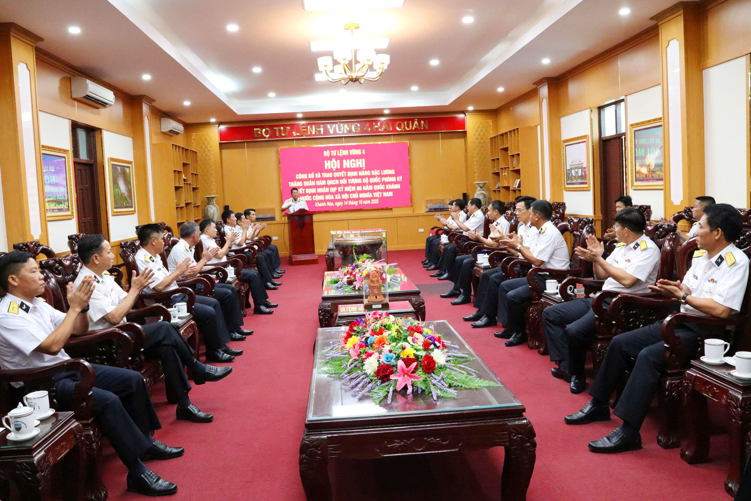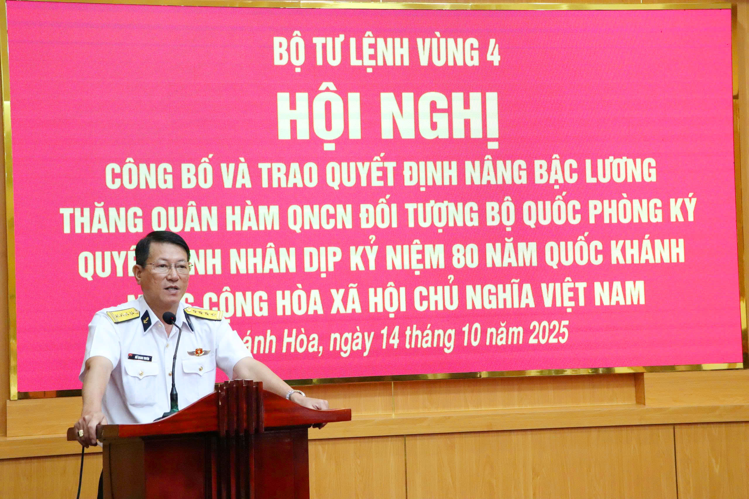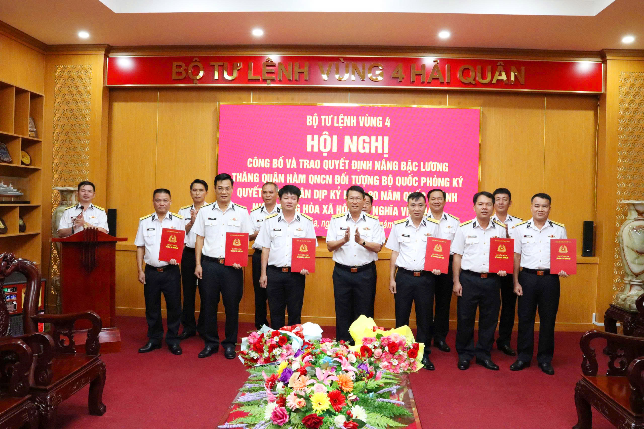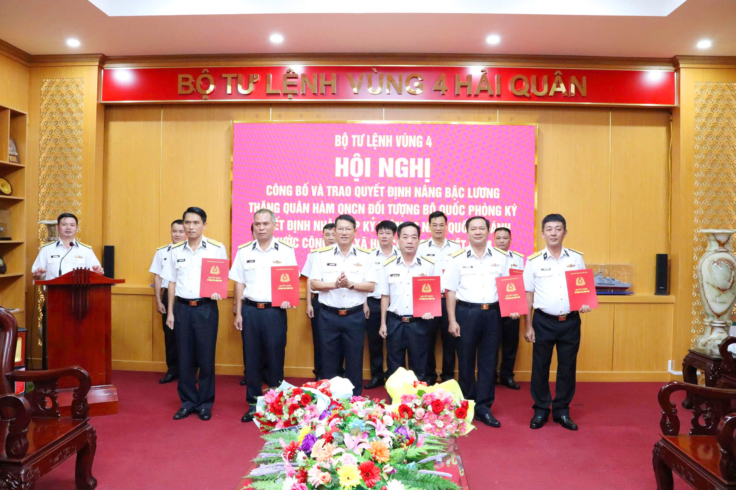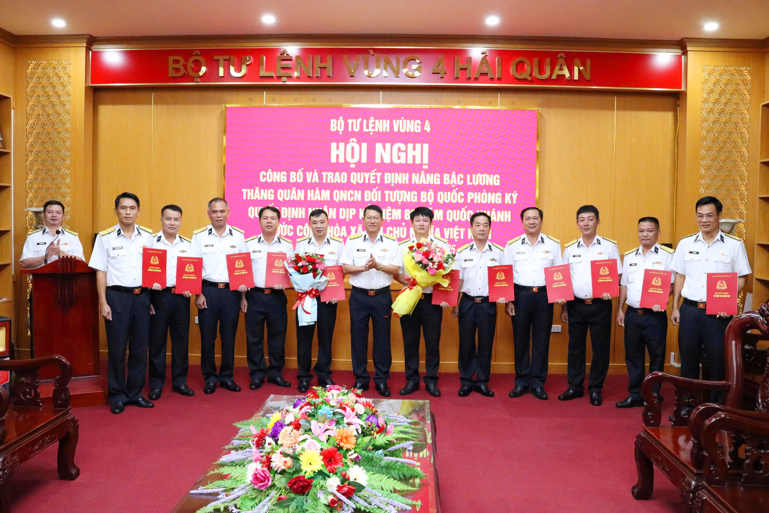 Tại buổi lễ, Bộ Tư lệnh Vùng đã công bố và trao quyết định nâng bậc lương, thăng quân hàm cho 14 đồng chí quân nhân chuyên nghiệp. Đây là sự ghi nhận xứng đáng của Đảng, Nhà nước, Bộ Quốc phòng, Quân chủng Hải quân và Bộ Tư lệnh Vùng 4 đối với quá trình rèn luyện, phấn đấu, cống hiến của đội ngũ quân nhân chuyên nghiệp trong thời gian qua.