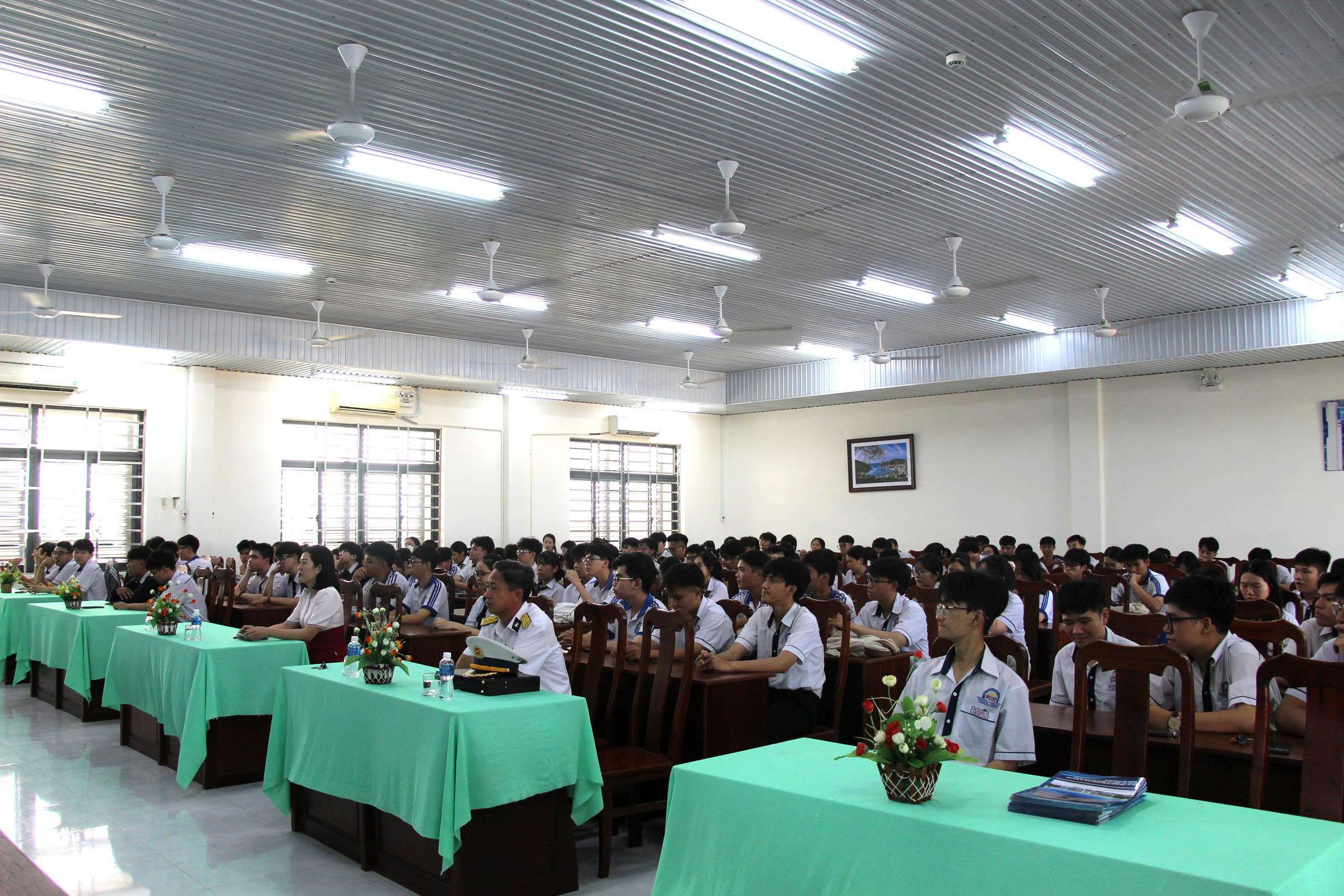 Không khí buổi tuyên truyền diễn ra sôi nổi với nhiều câu hỏi của học sinh xoay quanh điều kiện tuyển sinh, môi trường học tập, rèn luyện cũng như cơ hội công tác trong các lực lượng của Quân chủng Hải quân. Các nội dung được giải đáp cụ thể, giúp học sinh hiểu rõ hơn về con đường phấn đấu trở thành sĩ quan Hải quân trong tương lai.