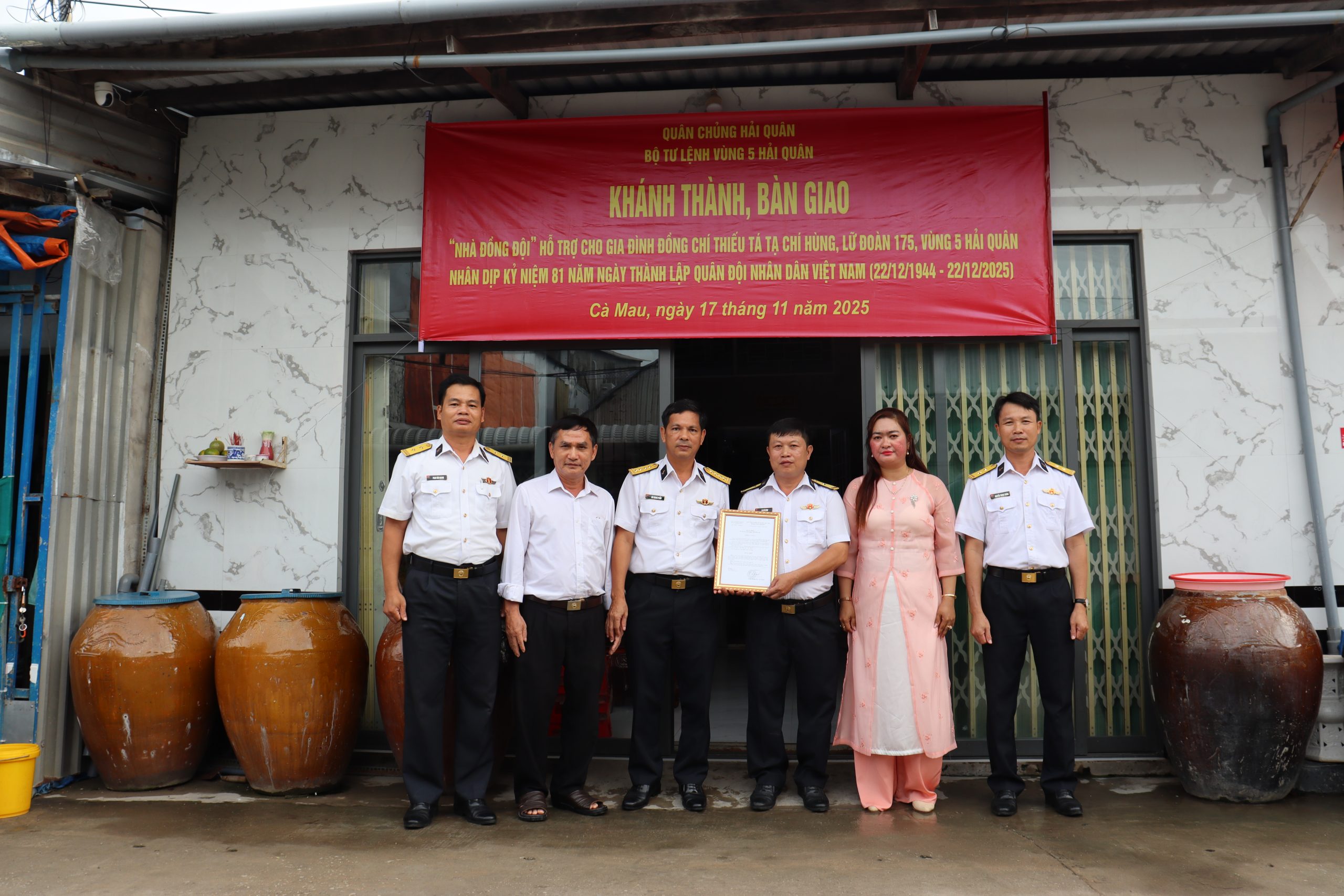 Tại buổi lễ, Đại tá Bùi Quang Phẩm đã trao quyết định bàn giao nhà đồng đội cho gia đình Thiếu tá Tạ Chí Hùng, Trợ lý Tài chính, Lữ đoàn 175, Vùng 5 Hải quân.